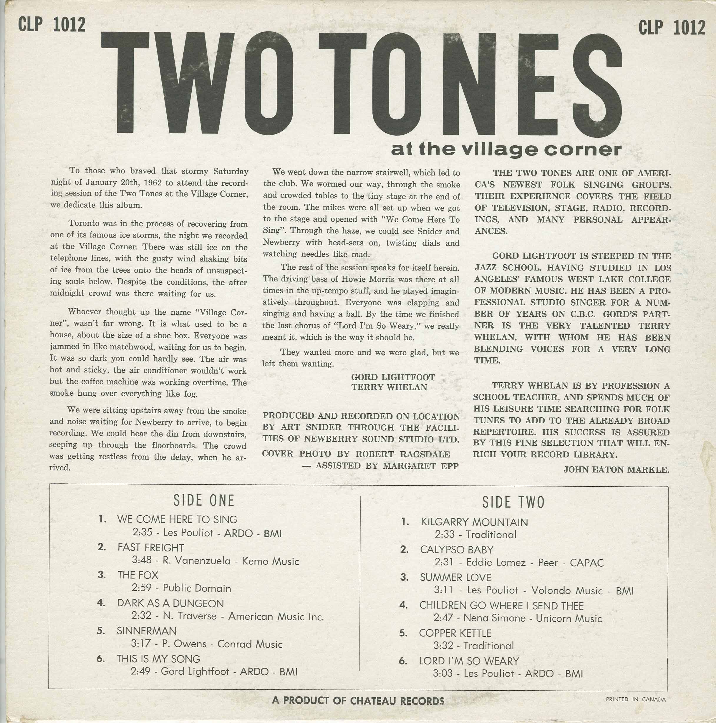These liner notes to the Two Tones At The Village Corner album from 1962 and co-written by Lightfoot are remarkable in their description of the atmosphere surrounding one of his early club dates, a scene repeated many, many times thereafter as he was soon to go out solo, until he ultimately graduated to the concert stage.