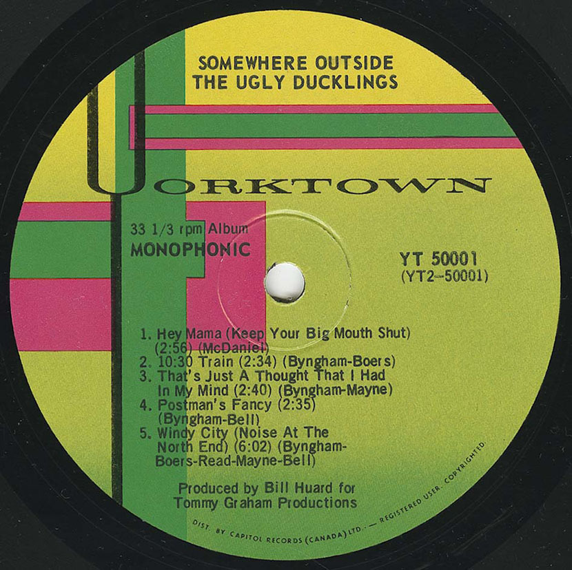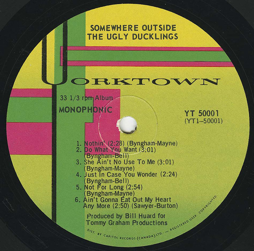 Released in early 1967 but containing the band's three 1966 singles, Somewhere Outside skirts the cusp of '66 r'n'b and '67 psychedelia. The LP opens with 'Nothin' and its prototypical garage riff, allegedly recorded on a two-track machine for $300 and pushed into regular rotation just a few weeks later by local deejays. Other tracks, such as the revved-up 'She Ain't No Use to Me' and the searing 'Just in Case You Wonder', their third single, capture on vinyl the hegemony of cool the Ducklings had over the Yorkville scene in Toronto at the time. Still other tracks, like the Rascalesque, harmonica-tinged 'Not for Long', add a quieter balance, while the closer 'Windy City (Noise at the North End)', an acid-blues rave-up, echoes Paul Butterfield's excursions of the same year.