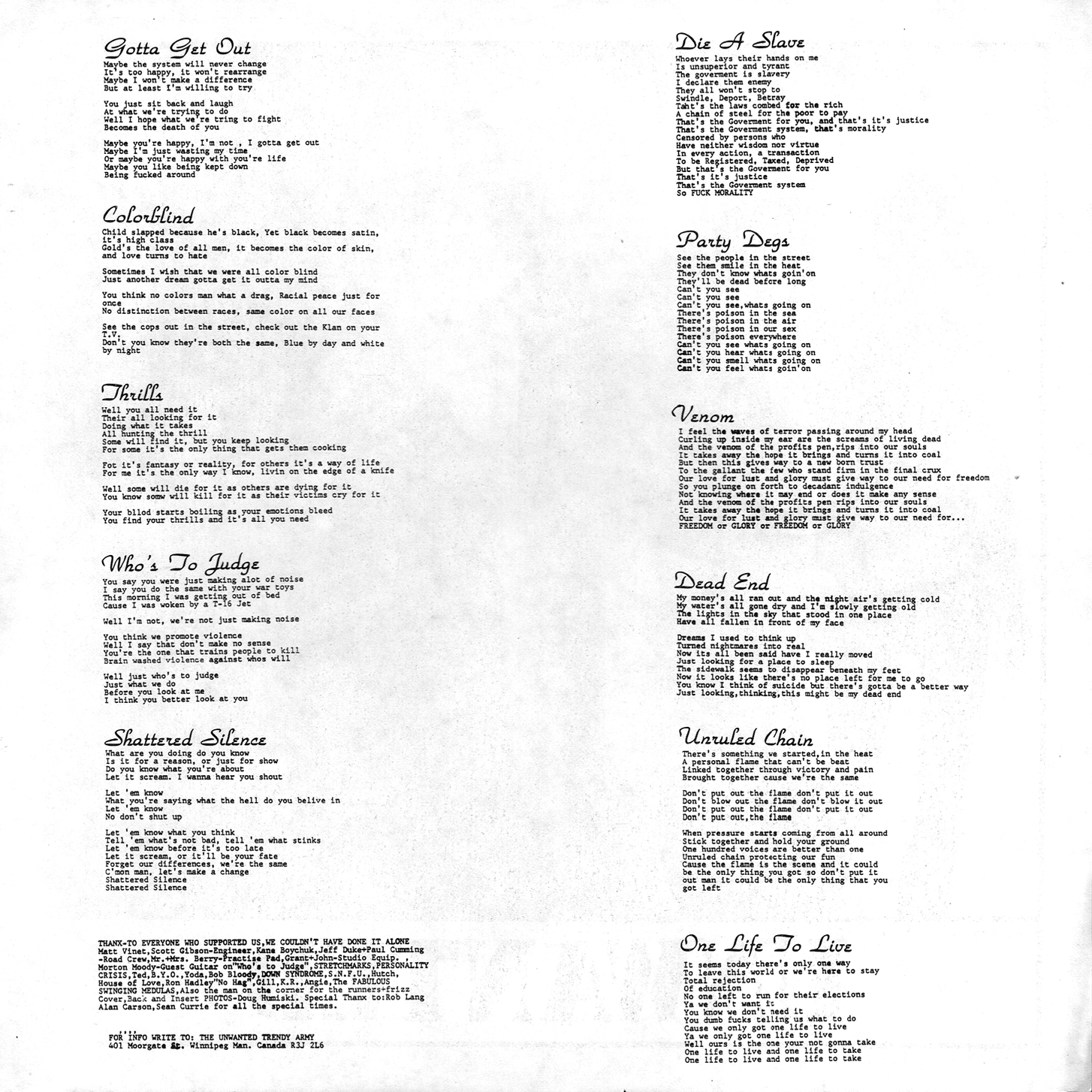 In 1984, Unwanted released their sole official LP, Shattered Silence, issued by Better Youth Organization / Head Butt Records. The album captured the band at full throttle, delivering eleven aggressive tracks that cemented their status as one of the most ferocious hardcore acts to emerge from the Winnipeg scene during that period. Despite touring and releasing vinyl, internal tensions led to the group’s dissolution in 1985, when bad blood ultimately split the band.