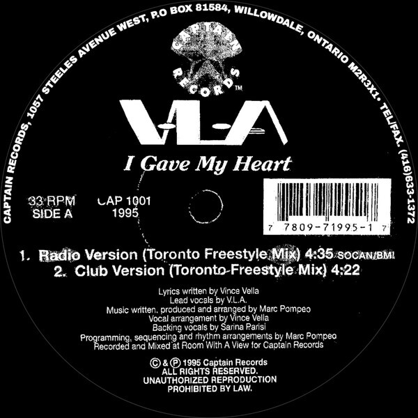 V.L.A ‘s second single again was produced by Marc Pompeo and is titled “I Gave My Heart” released on the compilation “freestyle is alive in 95” many consider this track a combination of euro, freestyle, Miami freestyle or dance; but to tell you the truth, its none of the above because Captain Records and V.L.A have officially titled it under the new category of “Toronto Freestyle”tm. This track coincidentally became V.L.A ‘s most popular underground freestyle track.