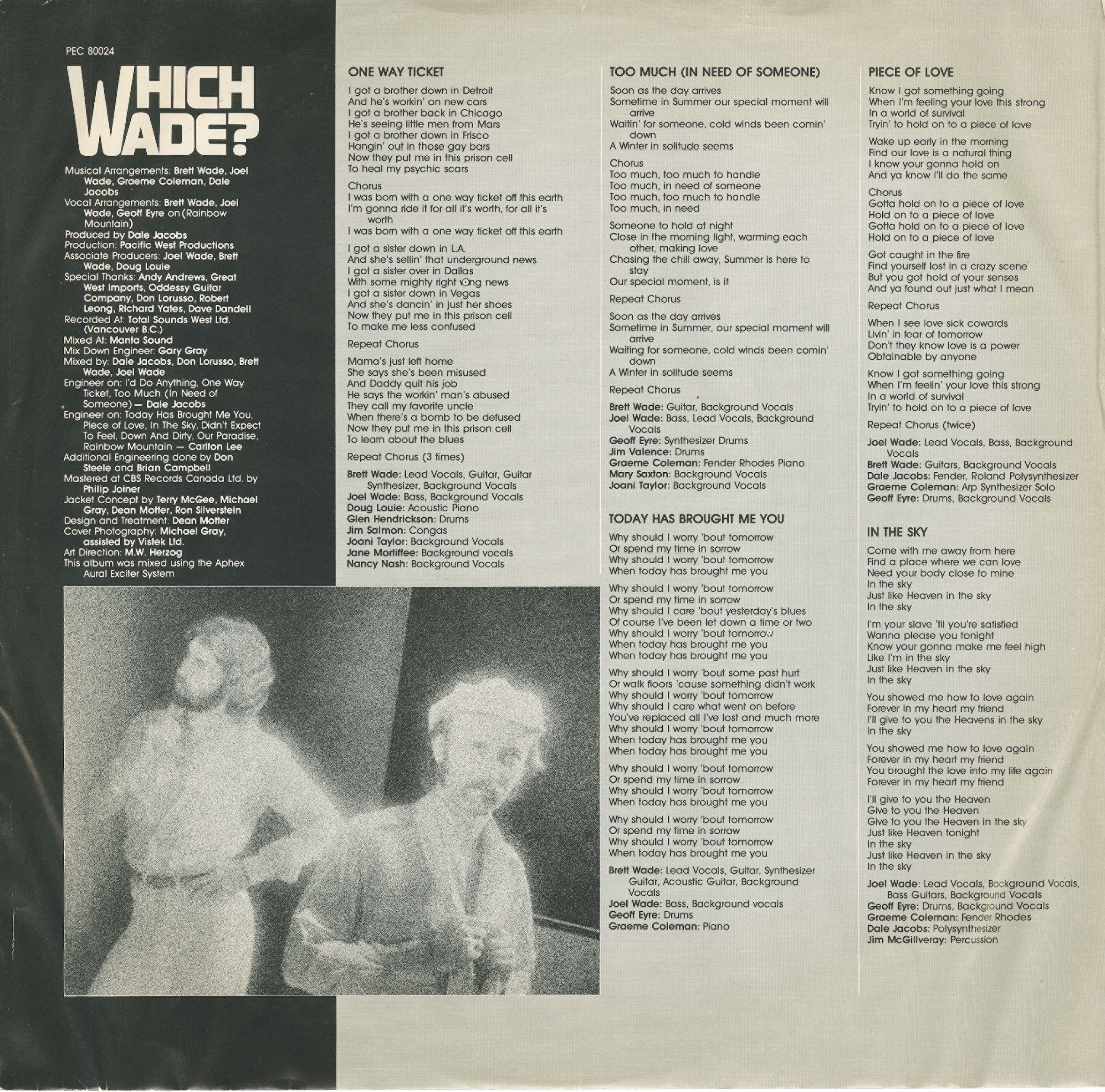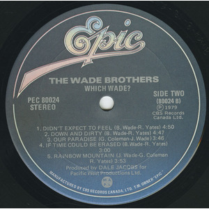 Working with producer and jazz keyboardist Dale Jacobs, the brothers began recording their debut album at Total Sounds West Ltd. in Vancouver, before mixing sessions at Manta Sound in Toronto. The resulting LP, Which Wade? (Epic PEC 80024, 1979), was one of the most technically advanced Canadian studio productions of its day. It featured the Aphex Aural Exciter System—then a cutting-edge studio enhancement tool—and an impressive roster of supporting musicians: Doug Louie, Graeme Coleman, Glen Hendrickson, Jim Vallance, Geoff Eyre, Mary Saxton, Joani Taylor, Jane Mortifee, Nancy Nash, and Melinda Whiticker among others. The sessions were co-produced by the Wades with Jacobs, and engineered by Carlton Lee, Don Steele, and Brian Campbell.