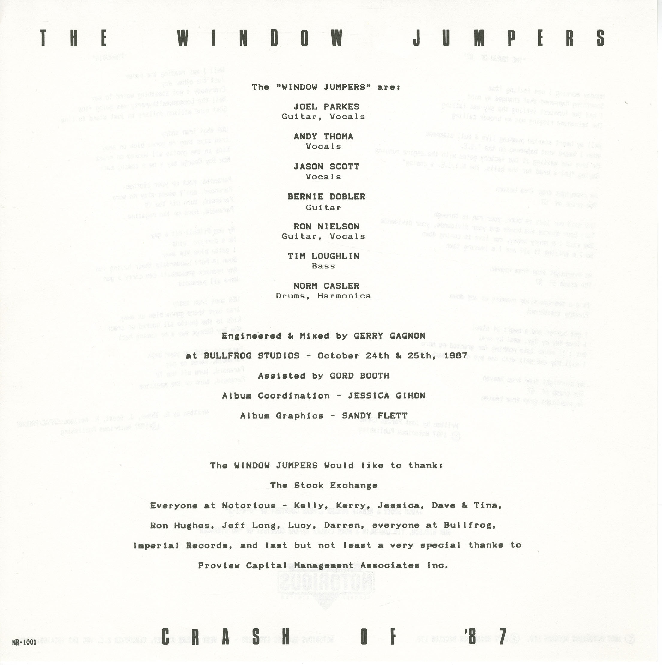 Everyone at Notorious – Kelly, Kerry, Jessica, Dave & Tina, Ron Hughes, Jeff Long, Lucy, Darren, everyone at Bullfrog, Imperial Records, and last but not least a very special thanks to Proview Capital Management Associates Inc.