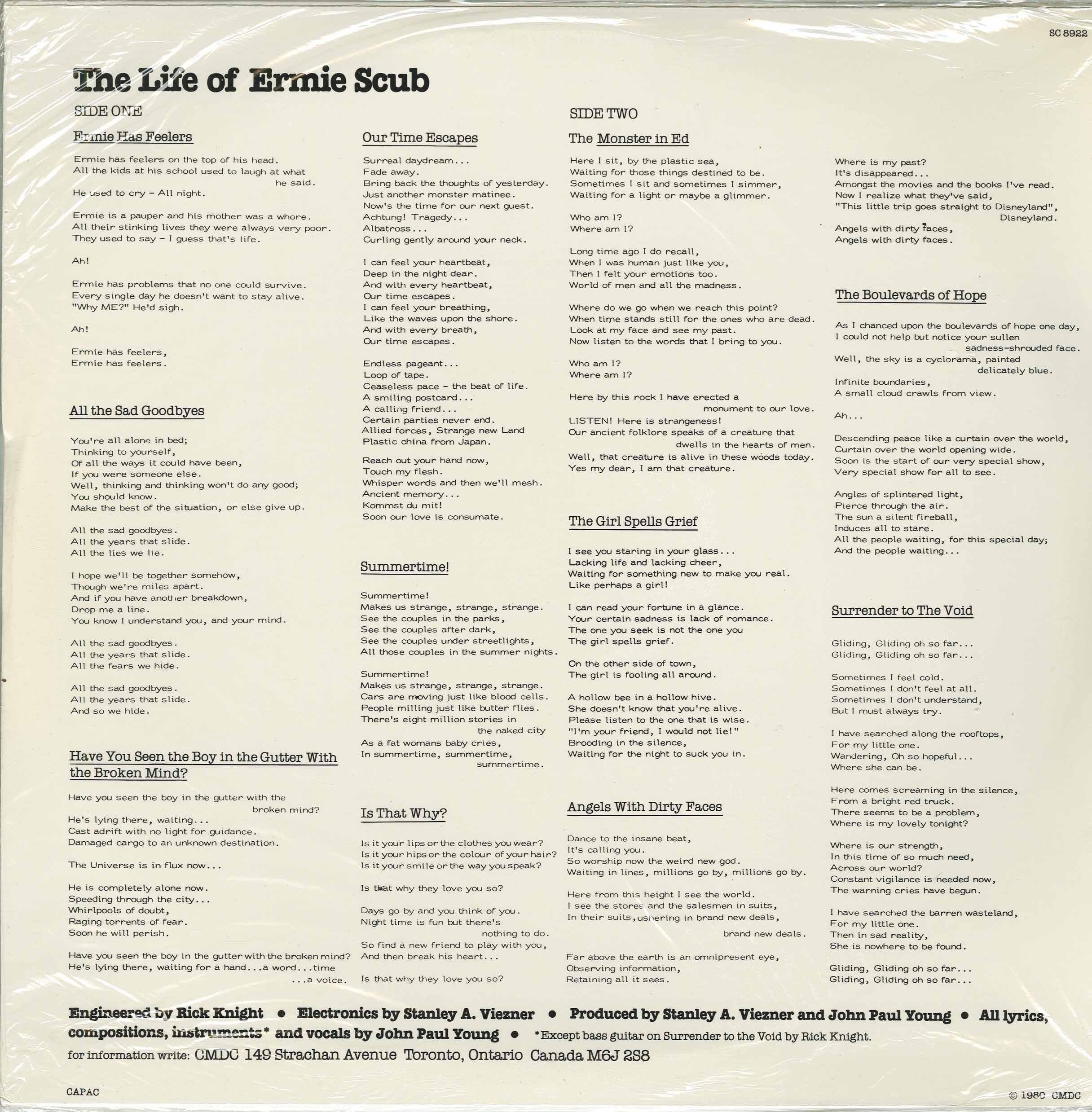 By 1980 Young had set off on his own, playing all the instruments on this quasi-conceptual collection of robot-like minimal synth tracks. And on a continent that was still digesting the original punk movement, The Life of Ernie Scub would surely have been as left-field as they came. With its period analog synths, percolating drum machines and disaffected vocals, the record had more in common with the early OMD, the Normal or even San Francisco's Units than much of what was happening in Toronto at the time. That said, the bulk of ...Ernie Scub is mopy and tedious, with Young's lethargic singing especially annoying. Still, there are flickers of brilliance here, like the two-minute 'Have You Seen the Boy in the Gutter with the Broken Mind?', a frantic electo-workout worthy of Martin Rev, or the whimsical synths on 'The Boulevards of Hope', which seem to edge curiously close to Residents territory (circa The Commercial Album).