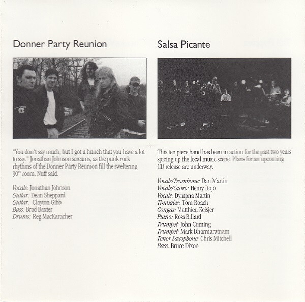 Too Many Daves (whose name comes from a Dr. Seuss story) is a group whose members’ involvement in Halifax’s alternative music scene spans more than a decade. The band’s summer 1992 live performance of the song ‘1906’ for the Cod Can’t Hear CD has also been released as an independent video, and recent recording sessions at Halifax’s Soundmarket will lead to an EP release later this year.