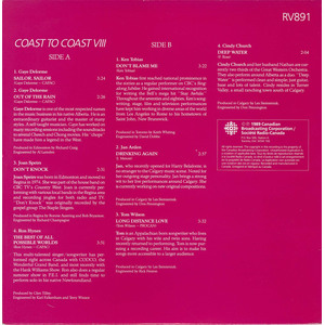 Coast to Coast VIII included many early and first original recordings by Canadian artists including first recordings by Gaye Delorme, Jann Arden, and Cindy Church as well as tracks by Ron Hynes, Ken Tobias Tom Wilson, and Joan Speirs that are unique to this album.