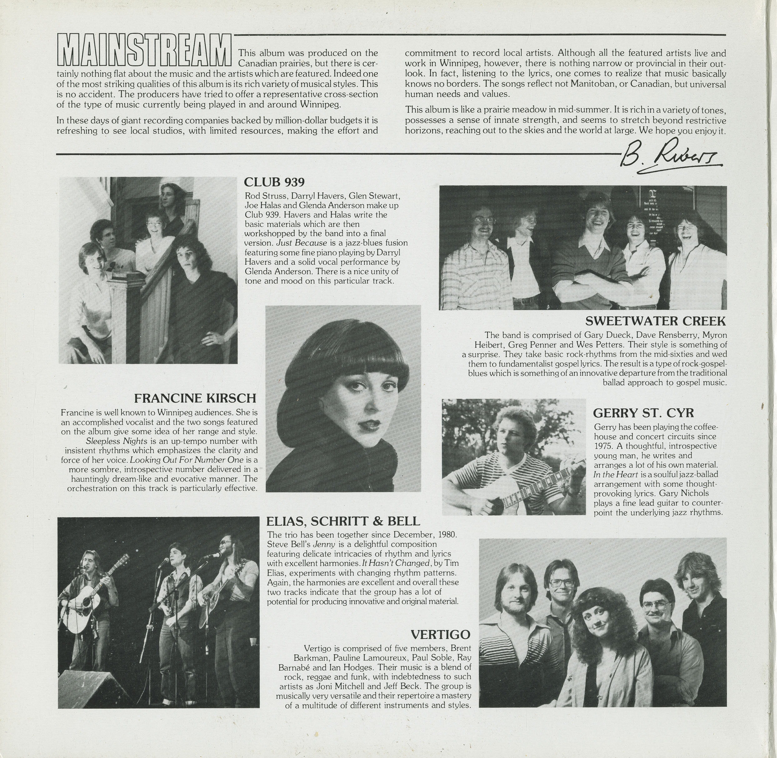 There is certainly nothing flat about the music and the artists which are featured. Indeed one of the most striking qualities of this album is its rich variety of musical styles. This is no accident. The producers have tried to offer a representative cross-section of the type of music currently being played in and around Winnipeg.