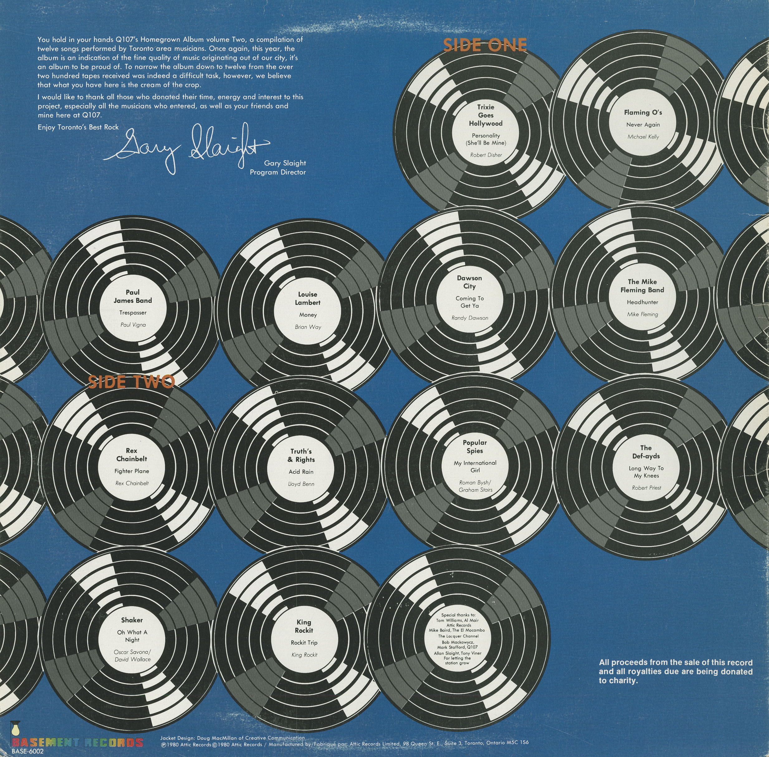 You hold in your hands Q107’s Homegrown Album Volume Two, a compilation of twelve songs performed by Toronto area musicians. Once again, this year, the album is an indication of the fine quality of music originating out of our city; it’s an album to be proud of. To narrow the album down to twelve from the over two hundred tapes received was indeed a difficult task; however, we believe that what you have here is the cream of the crop.