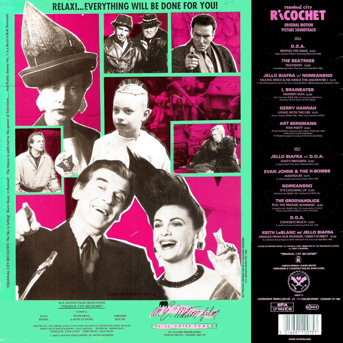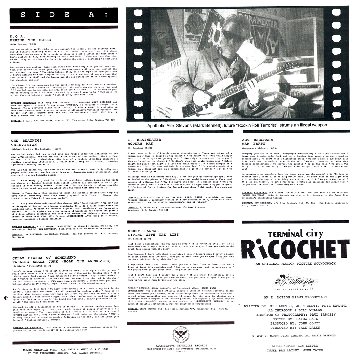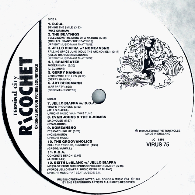 Starring Jello Biafra (of the Dead Kennedys), Terminal City Ricochet is a dystopian comedy critical of television and its collusion with government and consumerism. Terminal City Ricochet is well known in cult film circles, but it has only been shown at film festivals, and a few times on pay-TV. The DVD combo, (containing both the DVD of the film and a CD of the movie soundtrack) has been made available through the Alternative Tentacles Website. It was released in stores in October 2010.