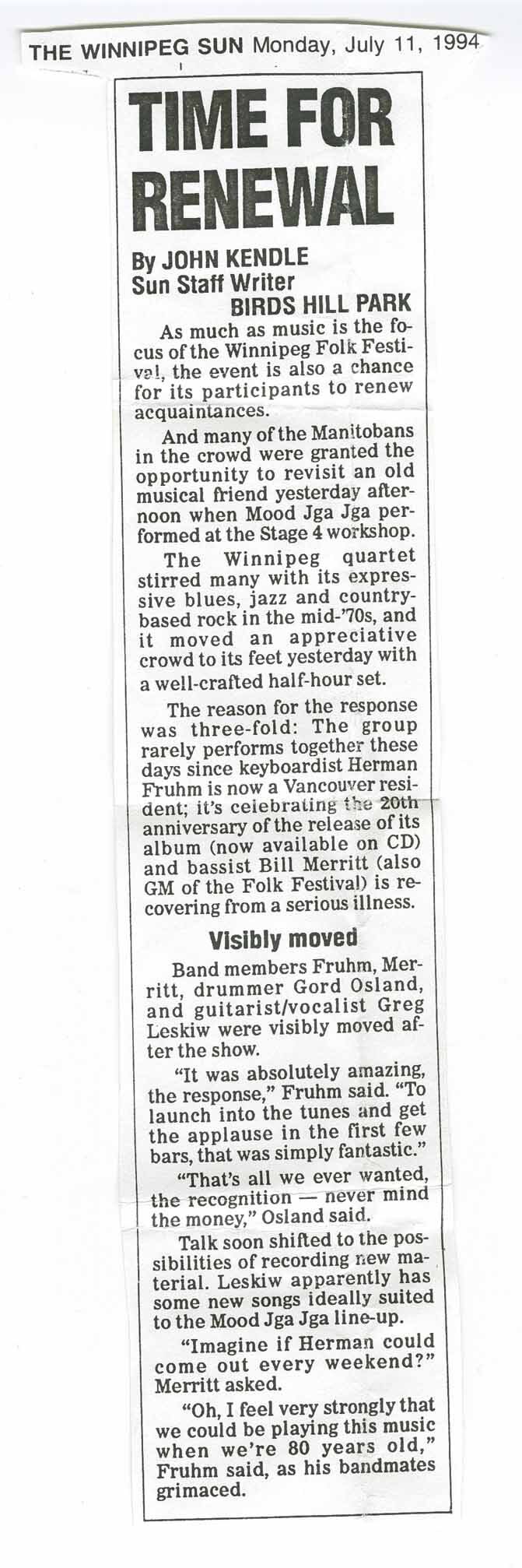 Mood Jga Jga gathered again in 1991 and made a recording for a CBC compilation Variety Recordings 6 on CBC VRCD 1006 (Gimme My Money/ Fine Time/ If You Ever Leave Me/ Sensible Lover/ Better Place, Better Time/ Why? Why? Why?). They re-isssued their album privately on CD, with the help of k.d. lang's manager Larry Wanagas, in 1994 in a limited pressing of 1000 copies. They re-formed a few times afterwards, appearing at The Winnipeg Folk and Jazz Festivals. They also got together again in 1997 and released "Boys Will be Boys", pressed privately on MJJ 0001 (Sensible Lover - Krautsuppe Song/ Better Place Better Time/ Dancing With Comrade I/ Boys Will Be Boys/ It's Gonna Get Better/ Desert Rain/ Herm's Toon/ Ma Cherie/ Forgive Him/ Dancing With Comrade II/ Be My Champion/ Interlude/ Universal Blues).