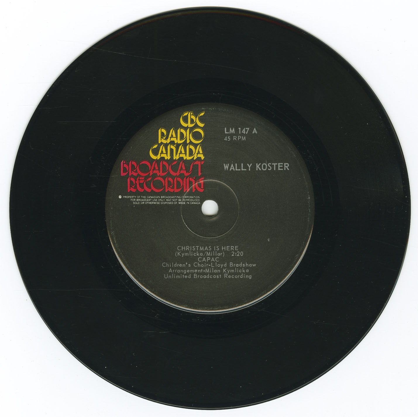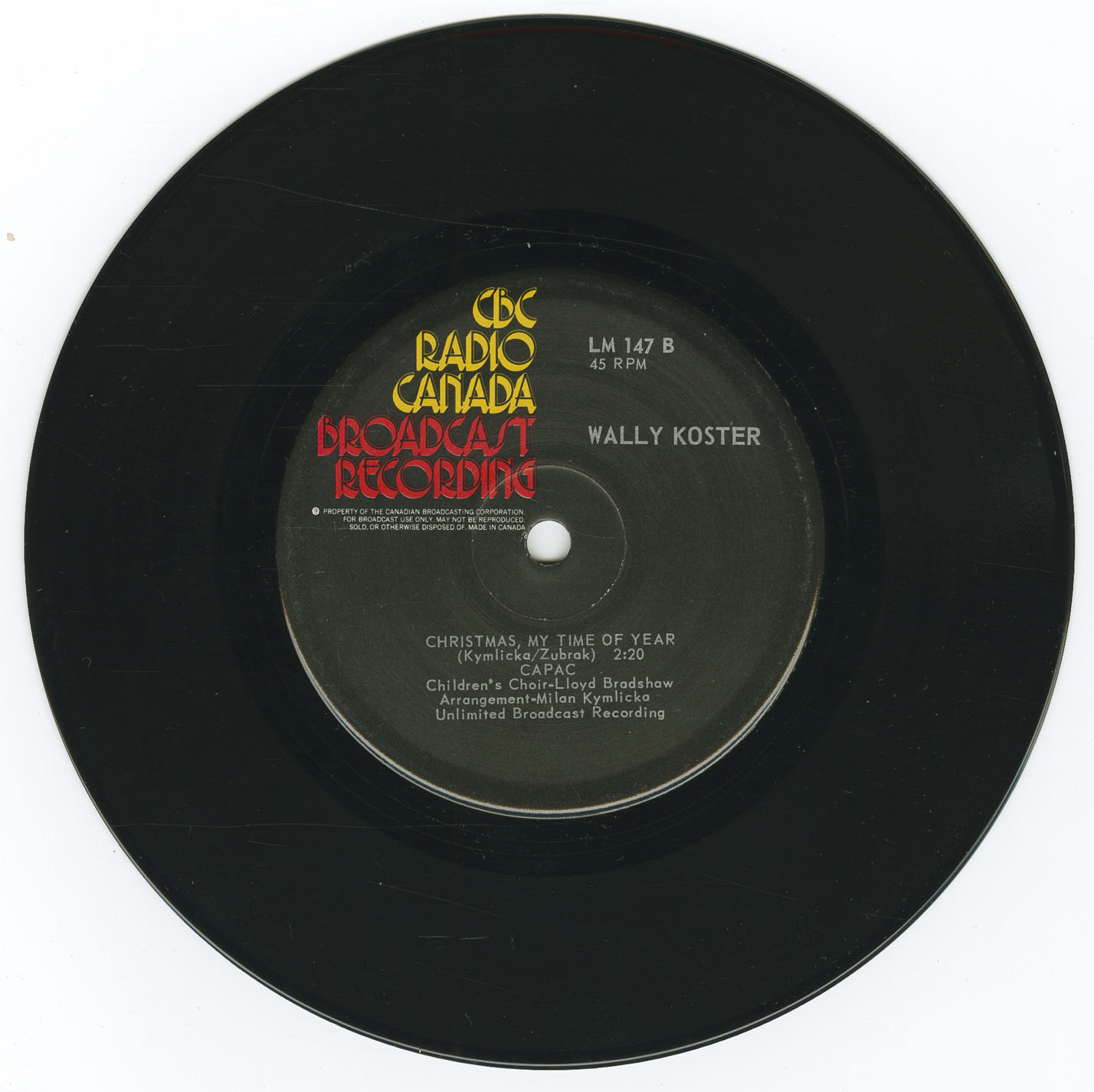 His final known single appearance came late in his career with the CBC Radio Canada LM-series 45 Christmas Is Here b/w Christmas, My Time of Year (LM 147), released in 1974. Arranged by Milan Kymlicka and featuring a children’s choir directed by Lloyd Bradshaw, the record reflects Koster’s enduring relationship with CBC and his comfort within formal, seasonal, and family-oriented programming. The songs were written by Milan Kymlicka with Will Millar (Christmas Is Here) and by Kymlicka–Zubrak (Christmas, My Time of Year).