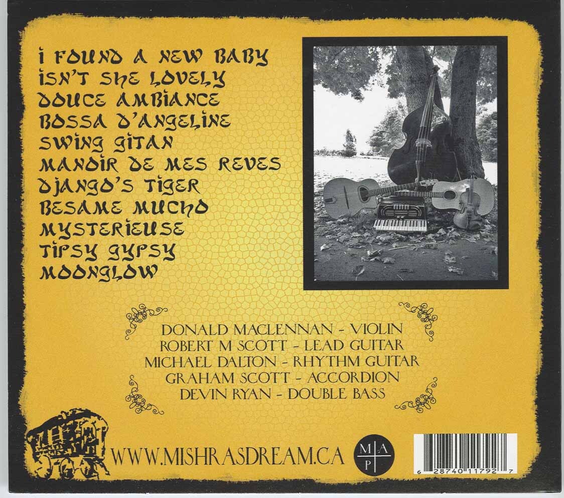 Paying homage to Gypsy Jazz legend Django Reinhardt are Antigonish's Mishra's Dream. From soaring gypsy ballads to hot jazz standards, the versatility and energy of this acoustic quintet keeps audiences mesmerized and their dancing shoes hot on the floor. With two guitars, a violin, a stand-up bass and an accordion, Mishra's Dream brings to life the style of French jazz made famous by guitarist Django Reinhardt and violinist Stephane Grappelli, while including other gypsy standards from various backgrounds. Mishra's Dream boasts a following both young and old, and are in high demand for many different functions and events, from wedding receptions to cafes, campfire jams to corporate events.