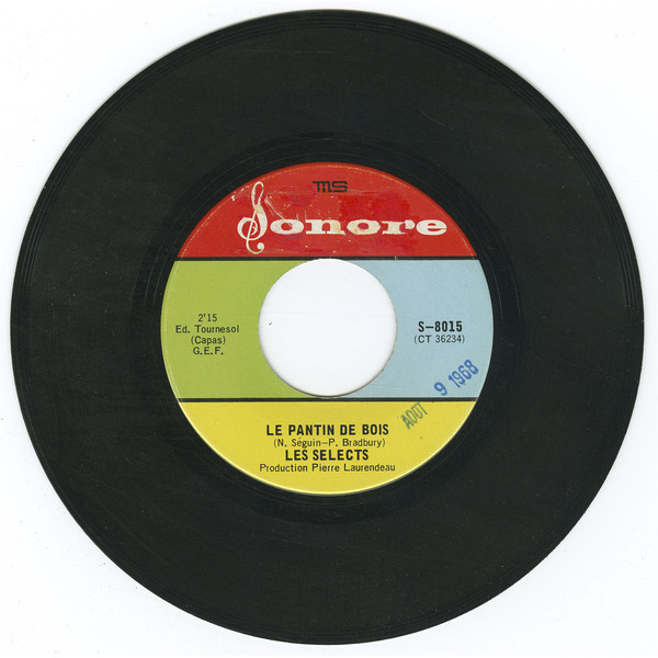 In 1968, the band signed with Sonore, where they released two singles that leaned into francophone pop-rock material. The first, “Ne pars pas, dis” backed with “Les voyages de l’amour” (S-8009), introduced a more melodic and modern approach. The follow-up later that year, “Le pantin de bois” backed with “Bye bye mon amour” (S-8015), pushed further in the same direction, with stronger arrangements and a more contemporary sound.