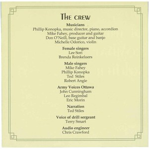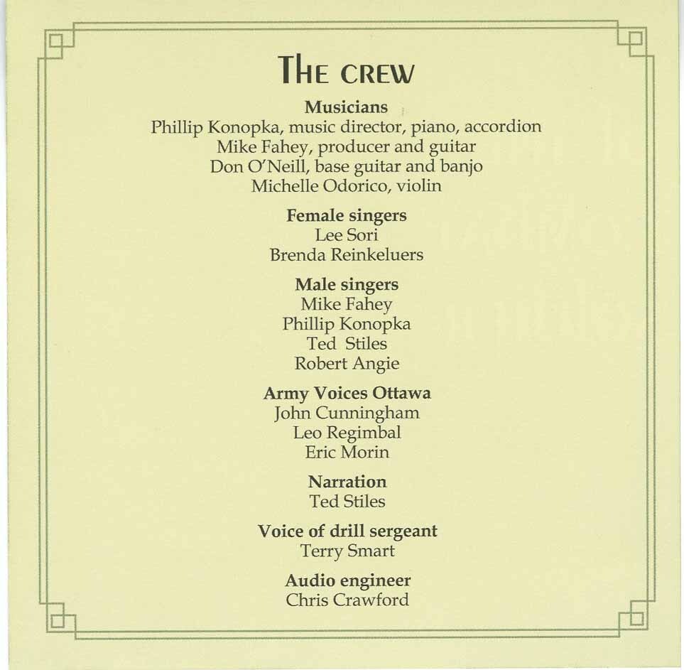 Phillip Konopka, music director, piano, accordion. Mike Fahey, producer and guitar. Don O’Neill, base guitar and banjo. Michelle Odorico, violin. Female singers: Lee Sori, Brenda Reinkeluers. Male singers: Mike Fahey, Phillip Konopka, Ted Stiles, Robert Angie. Army Voices Ottawa: John Cunningham, Leo Regimbal, Eric Morin. Narration: Ted Stiles. Voice of drill sergeant: Terry Smart, Audio engineer, Chris Crawford.