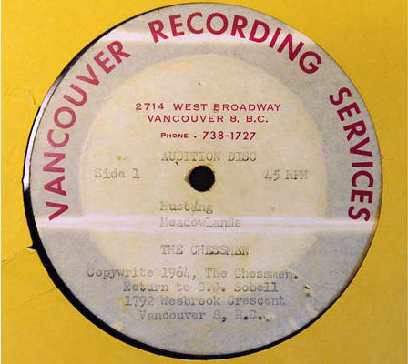 An “audition disc” by The Chessmen featuring Mustang and Meadowlands. A unique demonstration 45 by Terry Jacks' first band of note, The Chessmen, that used to belong to the band's other guitarist, Guy Sobell. The typewritten logo says “Copywrite 1964, The Chessmen, Return to G.J. Sobell, 1792 Wesbrook Crescent, Vancouver 8, B.C.” The label is from Vancouver Recording Services, Robin Spurgin's recording studio on West Broadway where many bands recorded in the 1960s.