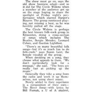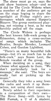 It was through the Students' Union at U of A and Jerry Slavick that The Circle Widens were asked to perform with Harper's Bizarre. This was to be their biggest gig yet! "We were really excited about it. It was a real opportunity to be appearing with a professional group", said Susan. From here, the band's reputation could only go up. They had a change to briefly tour outside of Edmonton, appearing in Leduc, Red Deer, Saskatoon, and Blaine Lake, Saskatchewan.