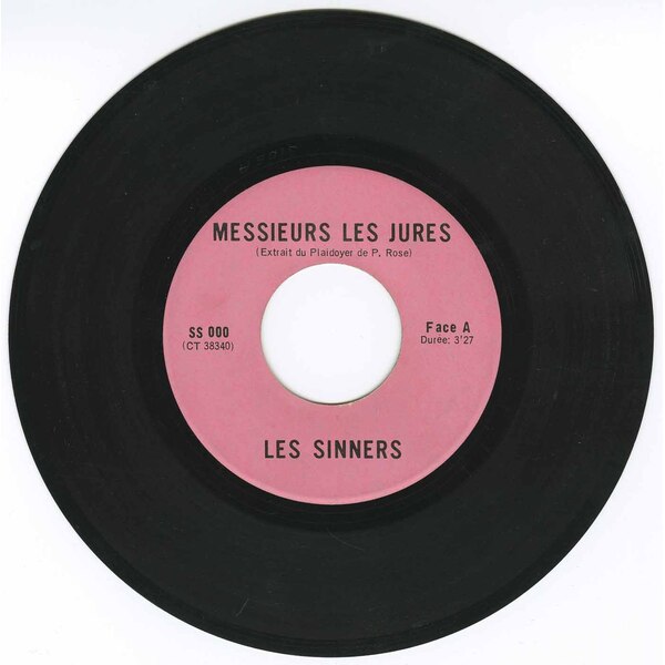 A rare, privately pressed 45 by Montréal’s Les Sinners—one of the most politically charged and historically significant recordings to emerge from Québec’s turbulent early-1970s counterculture. Side A, “Messieurs les jurés,” presents an almost verbatim transcription of the courtroom plea delivered by Paul Rose, leader of the Chénier cell of the Front de libération du Québec (FLQ), who in 1970 was convicted of the kidnapping and murder of Québec cabinet minister Pierre Laporte during the October Crisis. The text was reportedly collected from Rose in prison by Louis Parizeau, drummer and founding member of Les Sinners, and then set to music by the band—a striking collision of rock and radical politics at the height of Québec’s identity struggle.