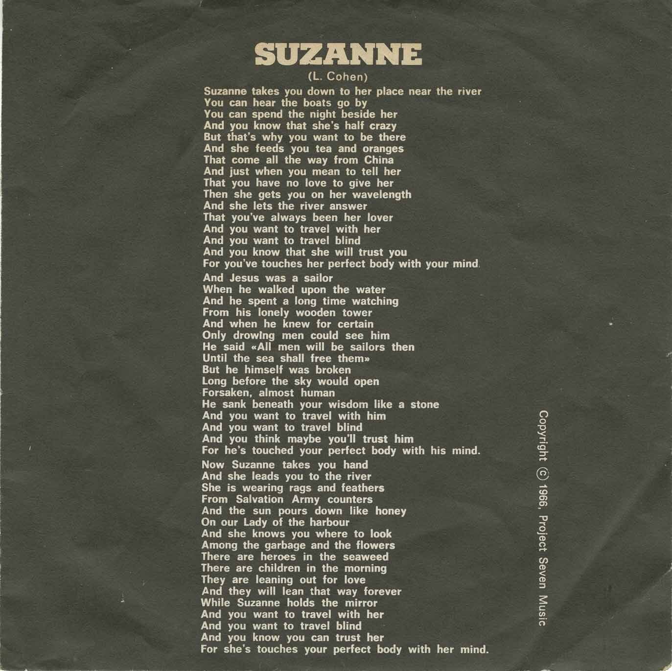 Suzanne: One of our mutual friends mentioned to me, ‘Did you hear the wonderful poem that Leonard wrote for you’ or about you and I said no, because I had been away traveling and I wasn’t aware of it. But apparently it got into the attention of Judy Collins, who urged Leonard to write a song based on the poem.