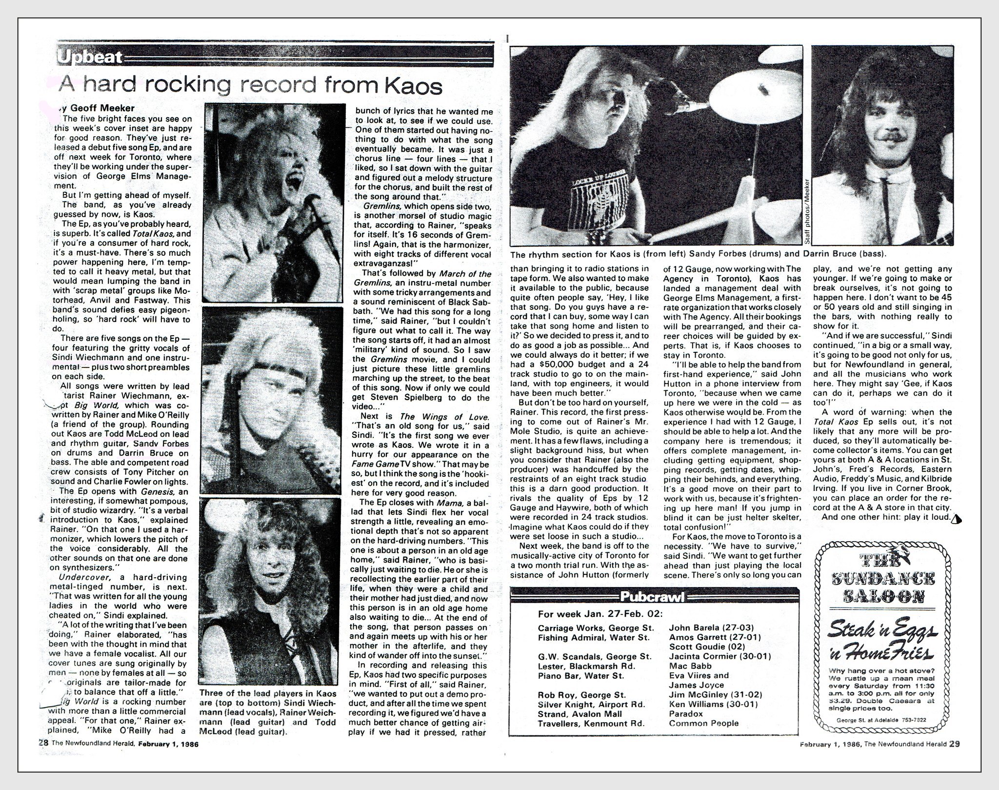 And the move to Toronto is a natural for a young, talented band rather than just playing on local scene. There’s only so long you can play, and we’re not getting any younger. If we’re going to make or break ourselves, it’s not going to happen here. I don’t want to be 40 or 50 years old and still singing in the bars, with the original Kaos songs no one has heard."