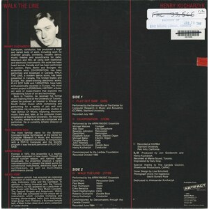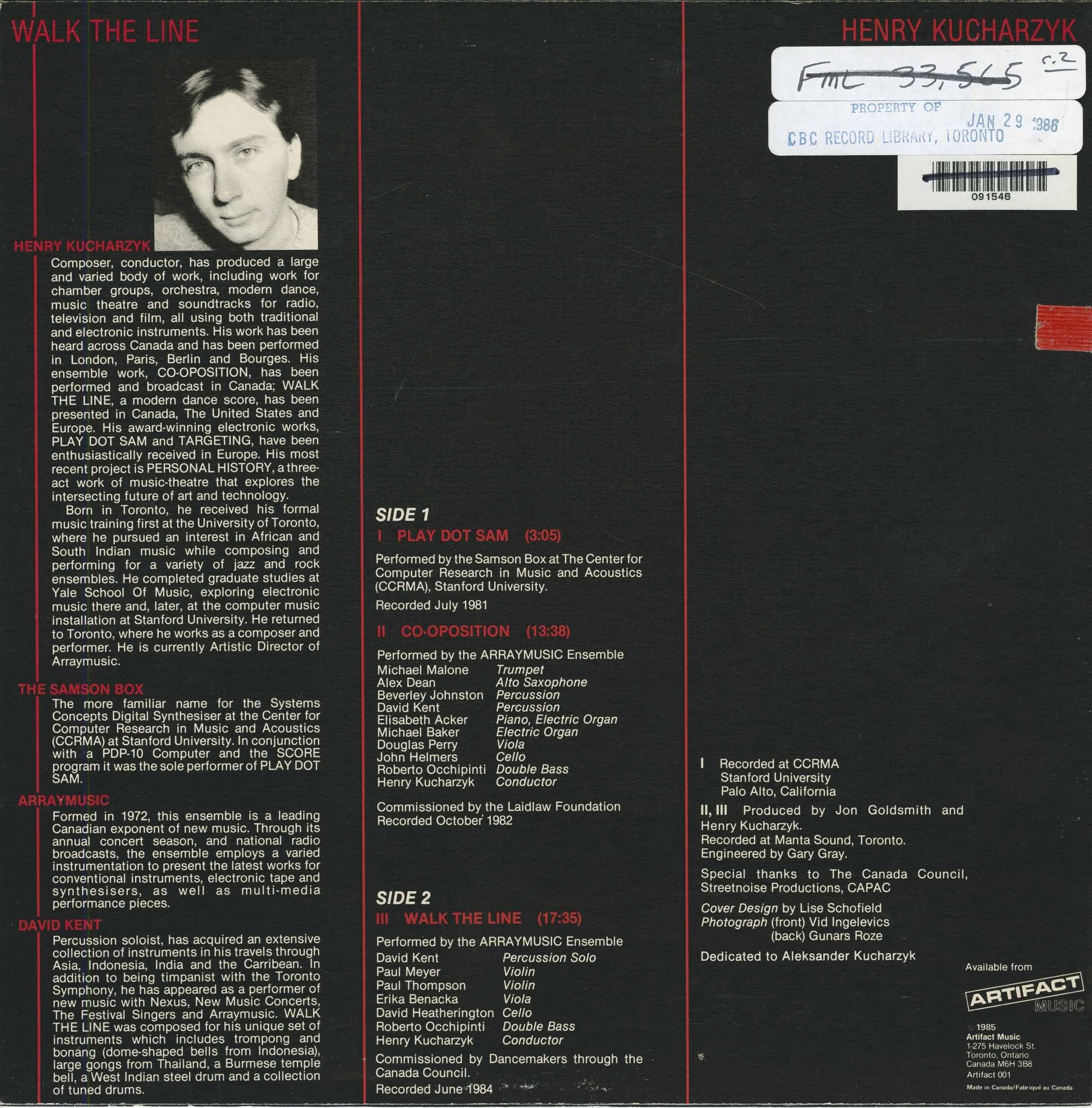 Kucharzyk has been commissioned by many of Canada's leading performers of new music, including Nexus, NMC, CBC radio, Le Quatuor de saxophones de Montréal, William Beauvais, Joseph Petric, the Canadian Electronic Ensemble, and Arraymusic. His Collisions for orchestra was commissioned by Les Grands Ballets Canadiens for Expo 86. He also has extensive experience as a composer for dance and theatre, having collaborated with such companies as Dancemakers (four times), Toronto Dance Theatre, Les Grands Ballets Canadiens, Danceworks and the Necessary Angel Theatre Company. From 1983 to 1986 he created Personal History, a full evening multi-media performance work. In 1985 he set up Artifact Music, a record label, and produced Walk the Line (ART-001), an LP of his own music, including his works Walk the Line (1982), Play Dot Sam (1981), and Co-oposition (1982).
