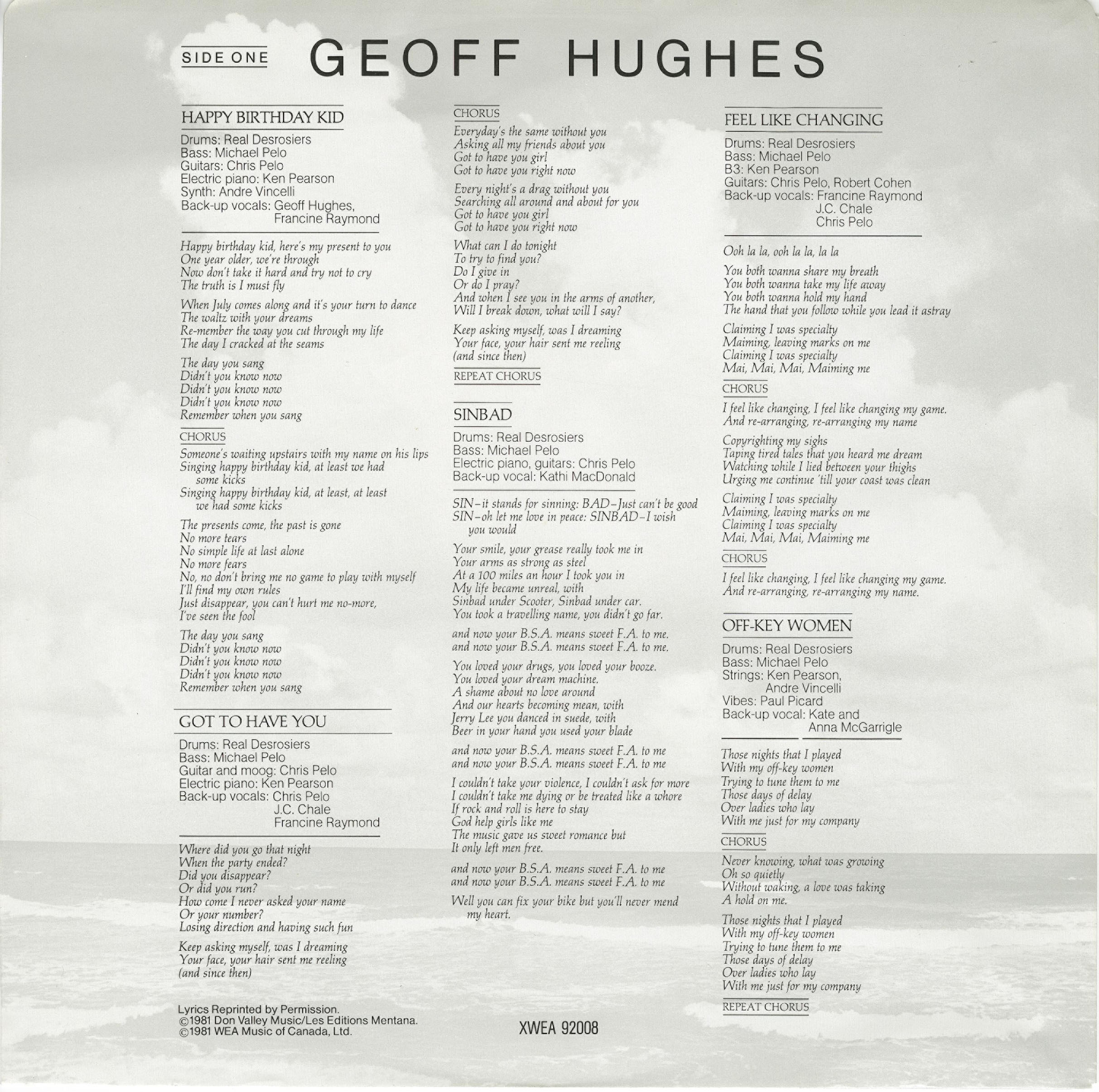 "There was a big recession and Warner got rid of all their artists except Daniel Lanois, they kept him," Hughes recalls. "He was a big star in Quebec, they had to keep him and everybody else including Geoff Hughes was let go ... I've still got the masters of the demos. There's some good stuff there. Unfortunately, there was nothing that stuck out, nothing as good as 'Happy Birthday Kid.'"