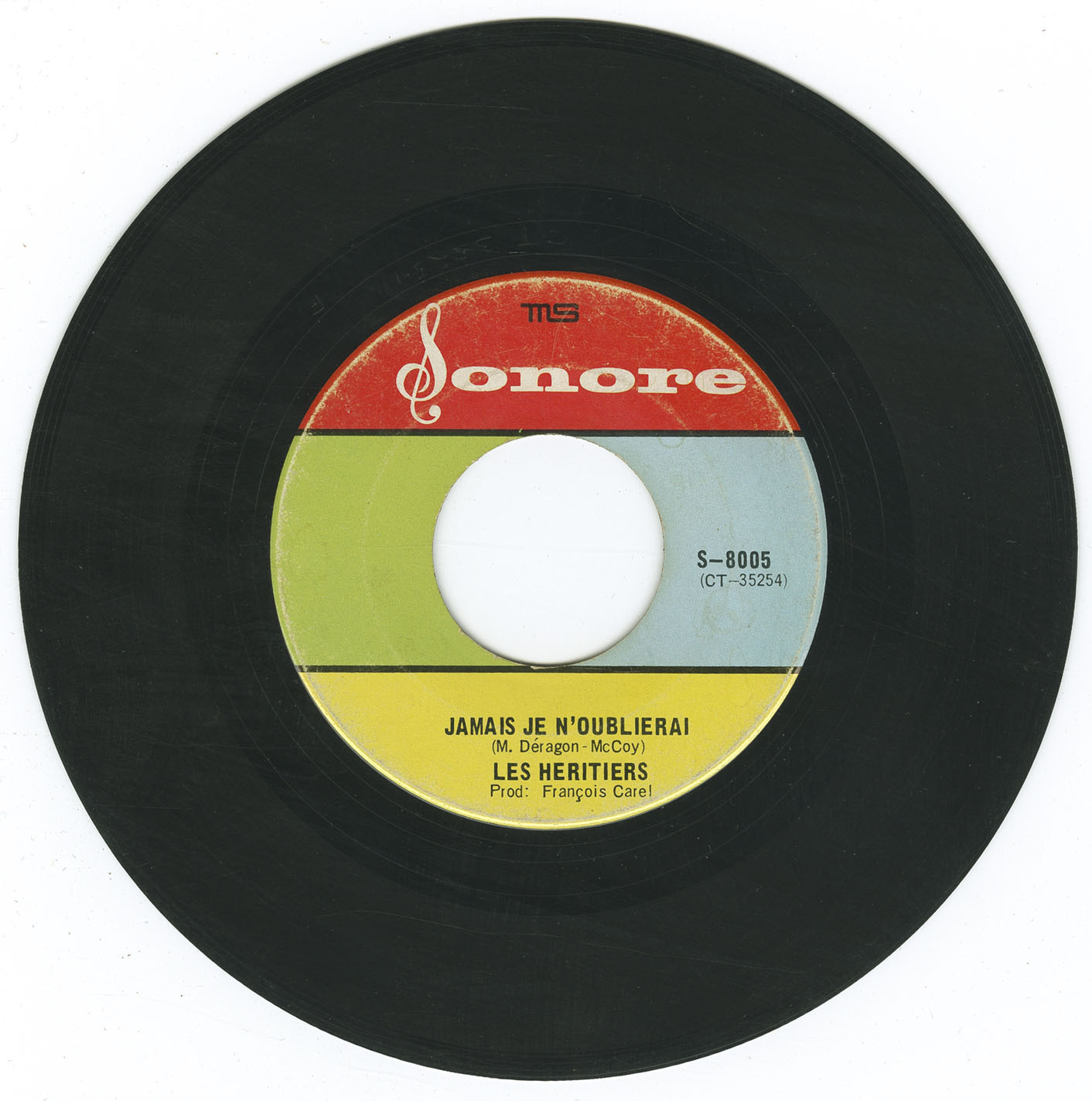 Les Héritiers were a Granby-based rock group active in the mid-1960s, part of Québec’s first wave of francophone pop-rock. Originally formed in 1964 under the name Les Venthols, they soon rebranded as Les Héritiers with a lineup that included Michel Déragon (vocals), Jean “Johnny” Gravel (guitar), Réal Perreault (guitar), André Thibodeau (bass), and Roger Belval (drums), later joined by Yves Caron (organ). Both Belval and Gravel would later find wider recognition in the legendary band Offenbach.