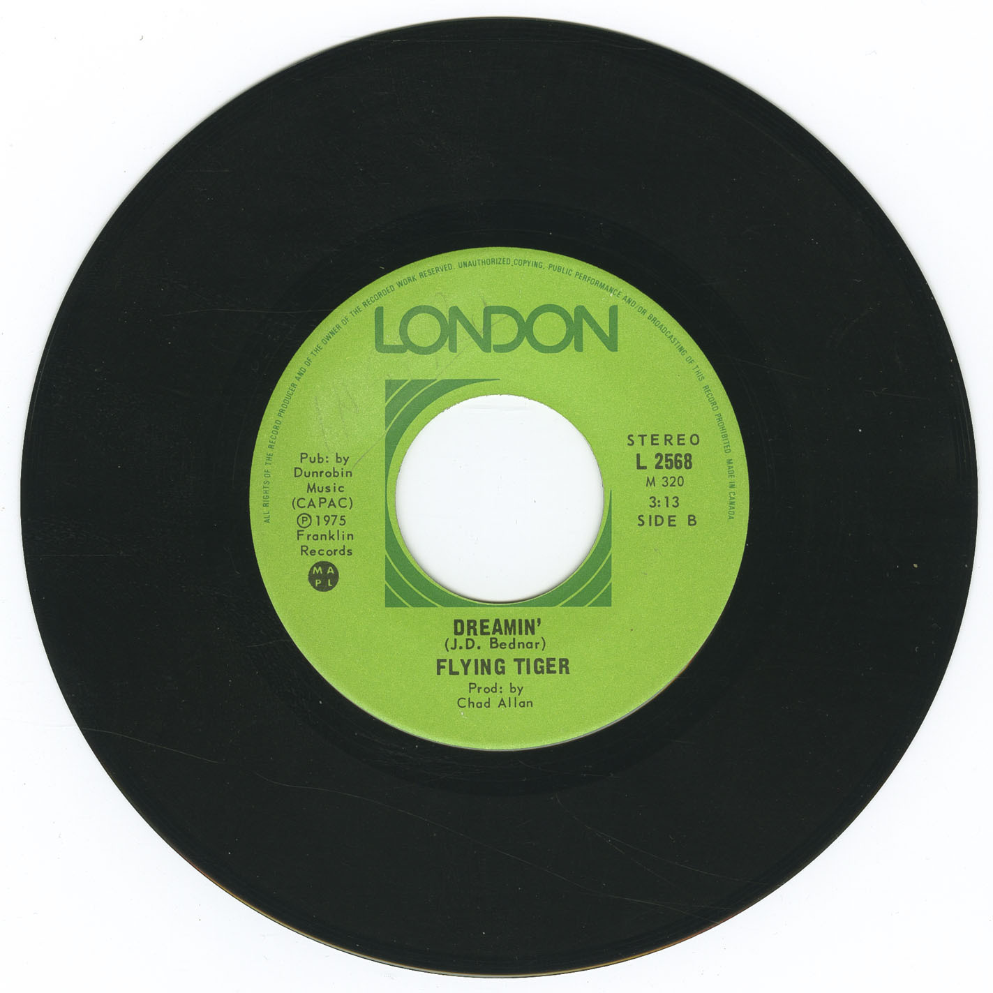 According to RPM Weekly (Vol. 23 No. 1, March 1, 1975), Allan was working out of Winnipeg’s Roade West Studios, where he was recording material for an upcoming solo album featuring all original compositions. During this period, he also took on production duties for Flying Tiger: