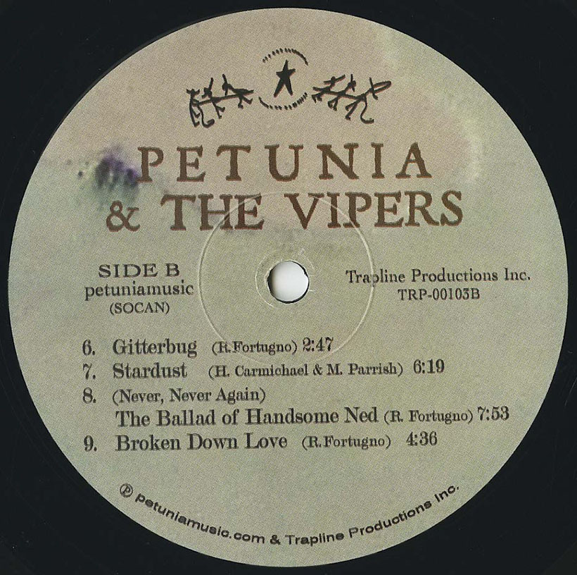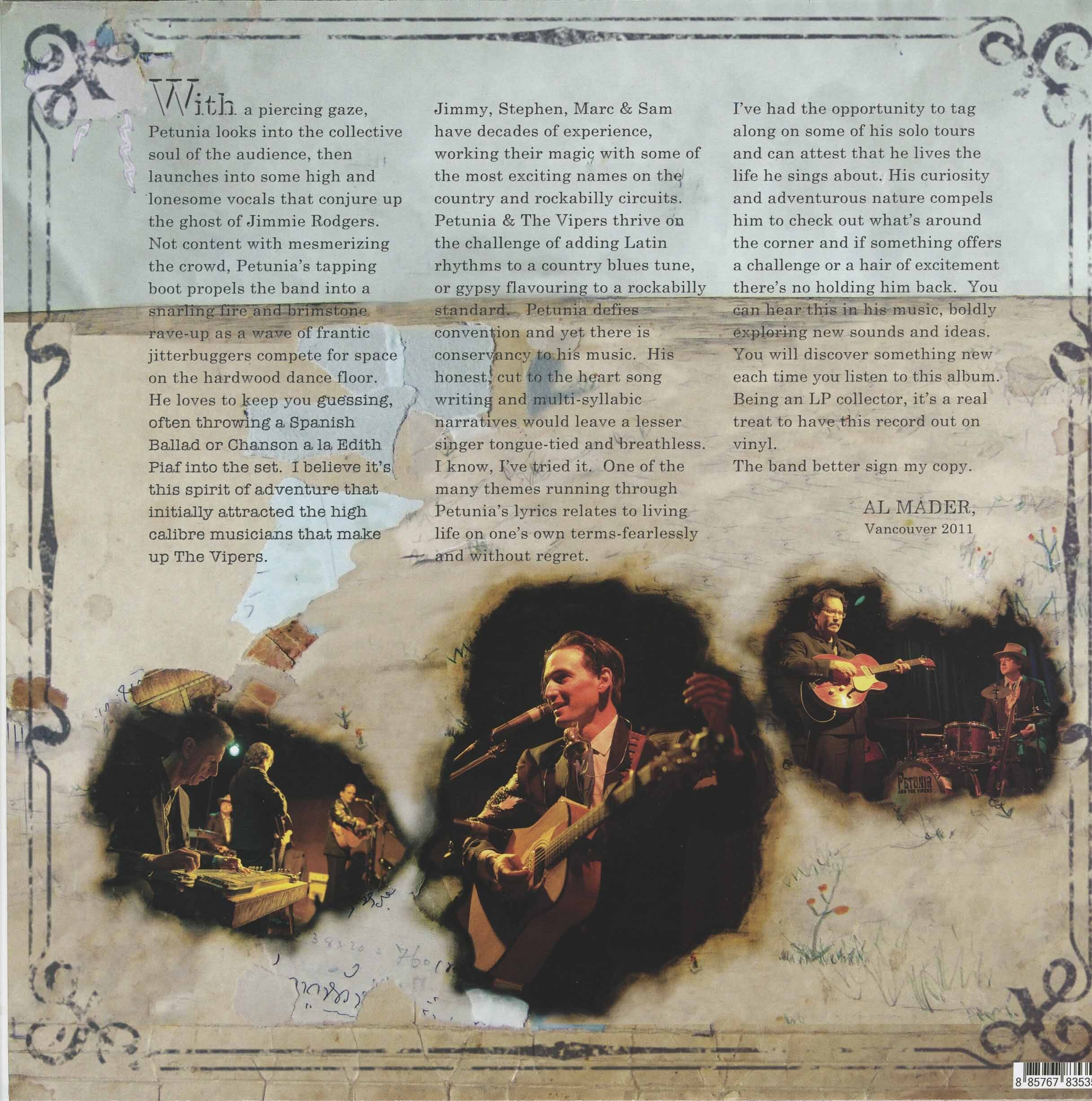 Sometime Vancouverite, full-time yodellin' cowboy Petunia often presents, live and on CD, a stripped-down take on roots music, with his obvious musical antecedents being Jimmie Rodgers and Hank Williams. His new LP - his first full-length to come out on vinyl (with bonus tracks on the CD) - vastly expands his domain, with energetic rockabilly rave-ups ('Maybe Baby Amy', replete with Jerry Lee Lewis yelps) and lush, complex arrangements (with lap steel guitar, horns, kazoo, piano, and deft drum work by Marc L'Esperance). There are also a couple of absolutely fantastic bits of songwriting in evidence, like 'Mercy', which yokes a swingin', revival-tent atmosphere to half-growled lyrics about guilt, sin, redemption, and gambling, delivered with a vocal fire and fury unheard on Petunia's solo CDs. Impressive stuff. This may well be the Vancouver roots-music release of the year.