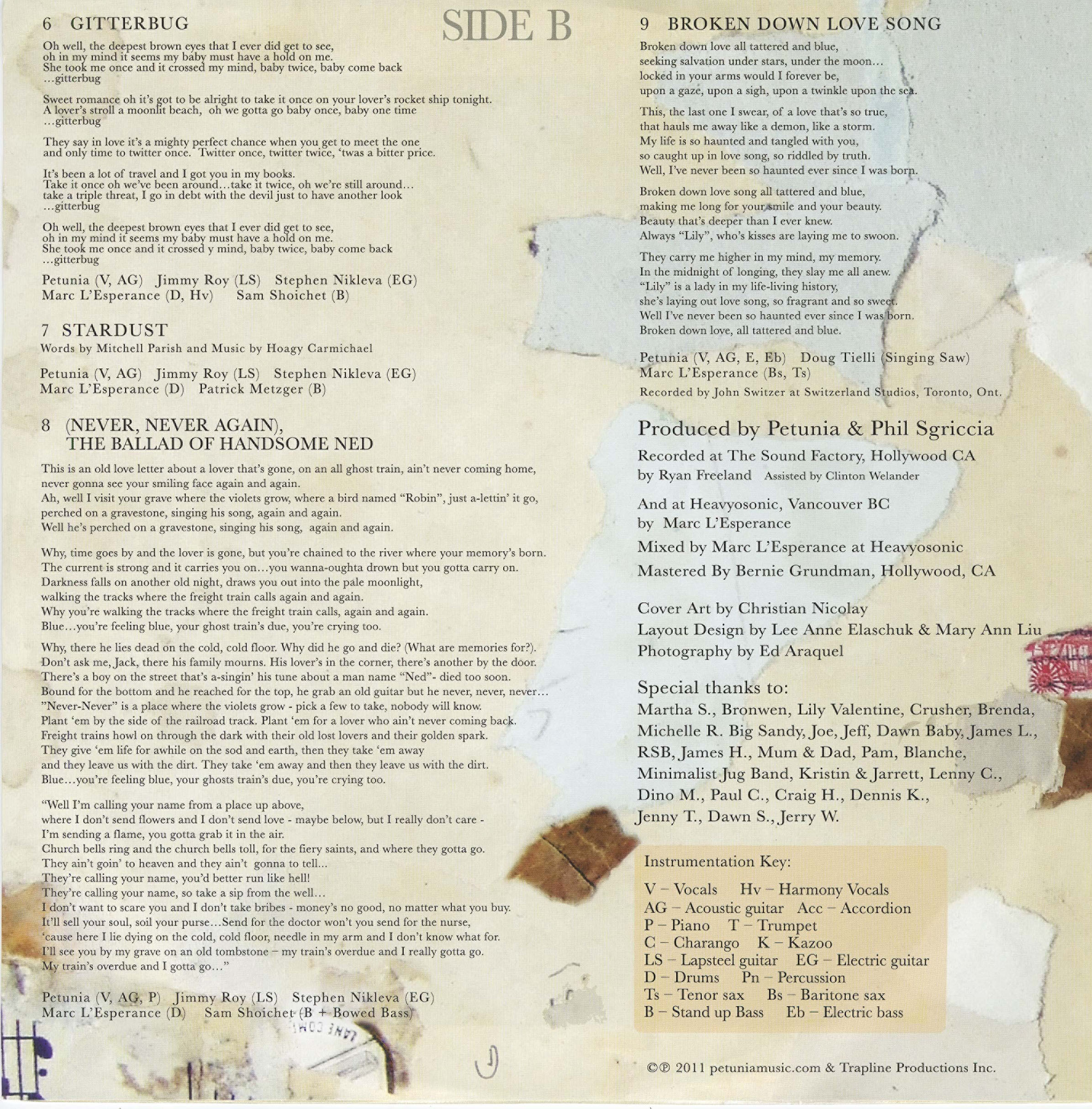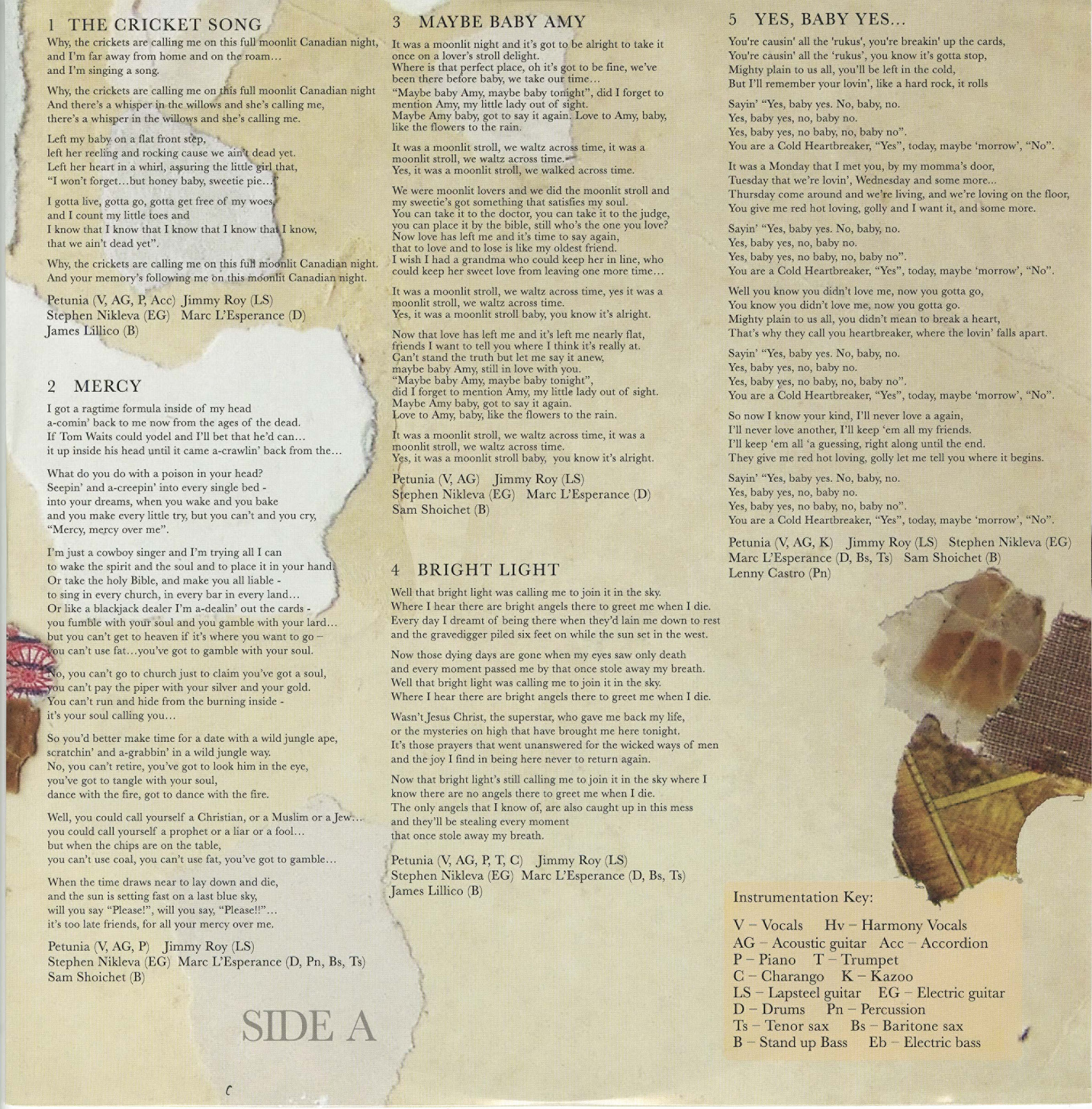 Petunia: vocals, acoustic guitar, trumpet, piano, charango, electric guitar, electric bass
