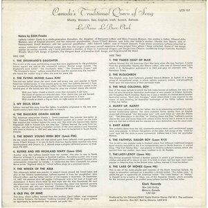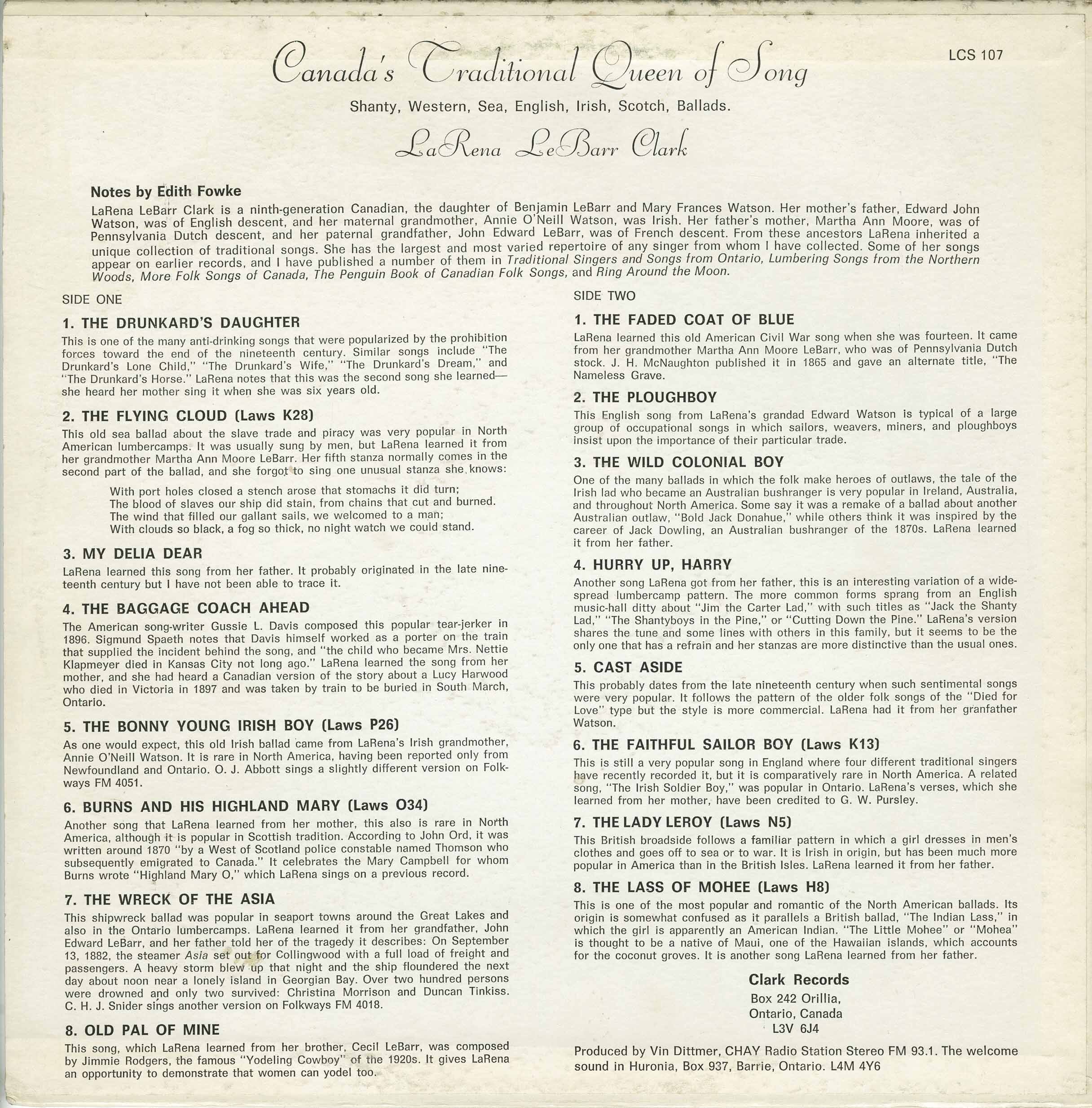 LaRena LeBarr Clark is a ninth-generation Canadian, the daughter of Benjamin LeBarr and Mary Frances Watson. Her mother’s father, Edward John Watson, was of English descent, and her maternal grandmother, Annie O’Neill Watson, was Irish. Her father’s mother, Martha Ann Moore, was of Pennsylvania Dutch extraction, and her paternal grandfather, John Edward LeBarr, was of French descent. From these ancestors LaRena inherited a unique collection of traditional songs. She has the largest and most varied repertoire of any singer from whom I have collected. Some of her songs appear on earlier records, and I have published a number of them in Traditional Singers and Songs from Ontario, Lumbering Songs from the Northern Woods, More Folk Songs of Canada, The Penguin Book of Canadian Folk Songs, and Ring Around the Moon.