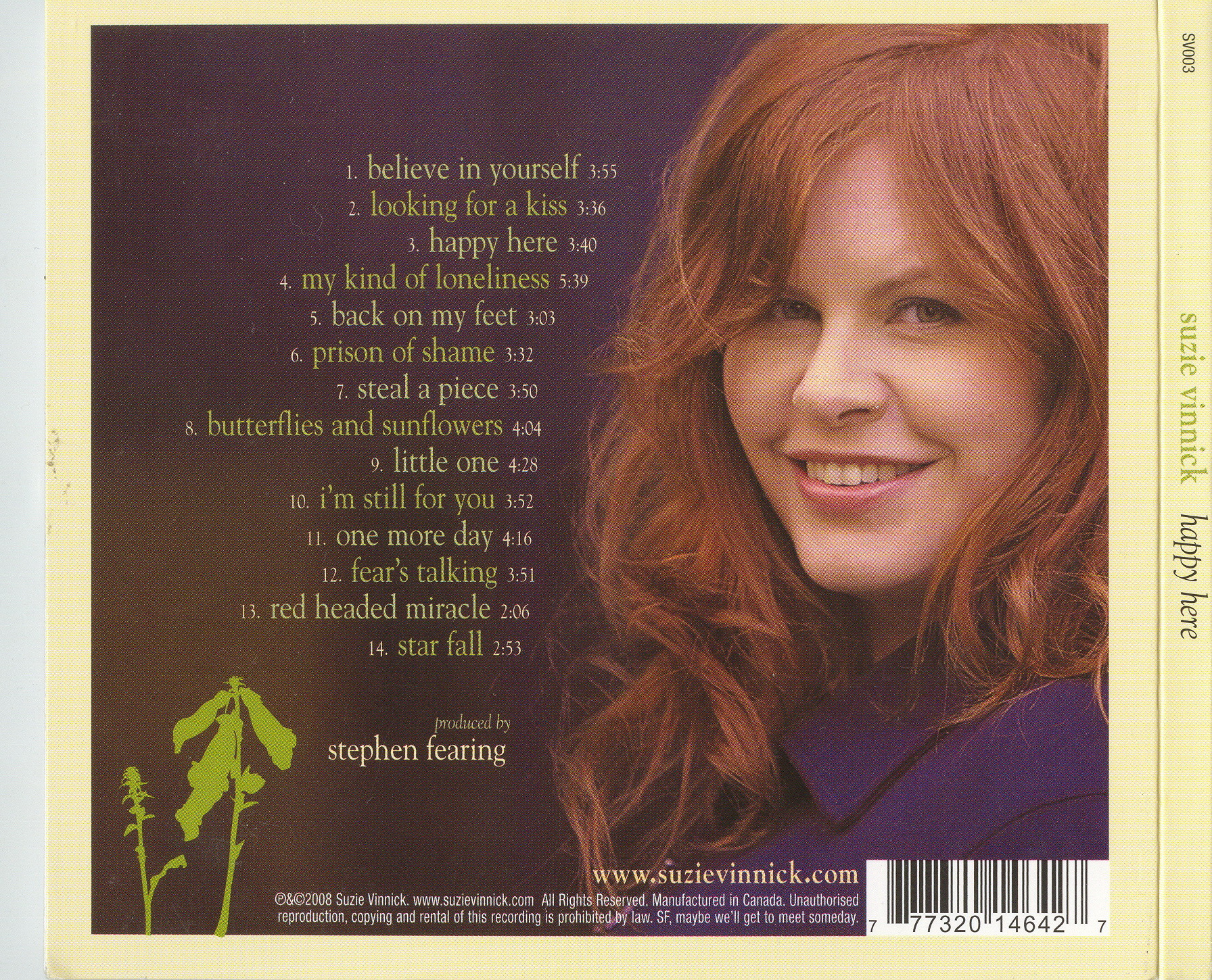 Unlike any of these, however, Suzie remains an undiscovered gem – well overdue the savoring of her just desserts. She’s worked tirelessly throughout her career to create the record that is destined to turn heads, to thrust her onto the world stage. Happy Here hereby moves Suzie from the passenger’s chair to the driver’s seat as she brings all her skills and seasoned confidence to bear on the mission ahead. Produced by Stephen Fearing, Happy Here is a masterwork and – creatively – a clearly defined mark-in- the-sand. Whether she’s cooing like Dusty through the positively sublime "Believe In Yourself " or purring alongside Paul Reddick on the hook-rich "Looking For A Kiss", Suzie declares ownership of the turf. From the drop-dead, quintessential Vinnick song – and title track, with its pedal steel and percussive rhythm, Suzie simply soars above each exotic mix. Fearing pulls out all the stops to tastefully embellish that crystalline voice to redefine her rootsy blend through use of harp, strings, horns, accordion, mandolin and guitar as required. Case in point – "My Kind of Loneliness " – as perfect a song and as blissful an arrangement as has ever come together on a Canadian recording. Vinnick’s songwriting has been acknowledged with several high profile awards over the years but her hand is clearly involved in each of the fourteen tracks found here.