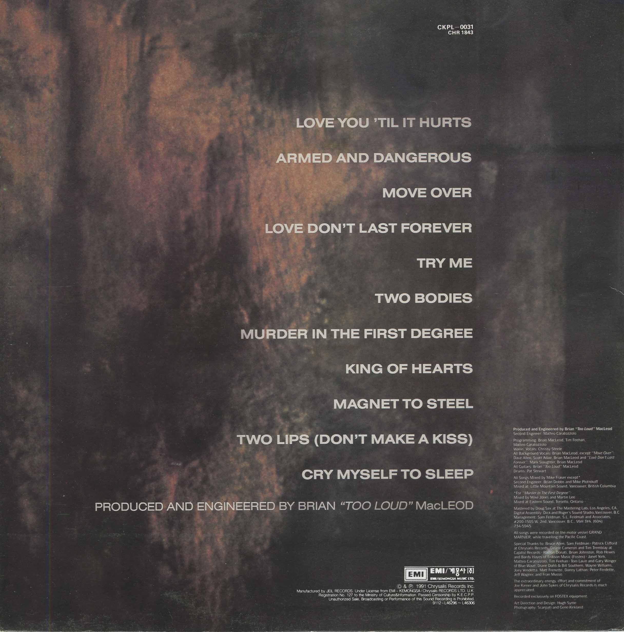 Magnet To Steele is the debut effort from this Canadian native. Songs like "Love You 'Til It Hurts", "Move Over", "Murder In The First Degree" and "Magnet To Steele" really rock hard. Of course there are your typical slower paced numbers in "Love Don't Last Forever" and "Cry Myself To Sleep".