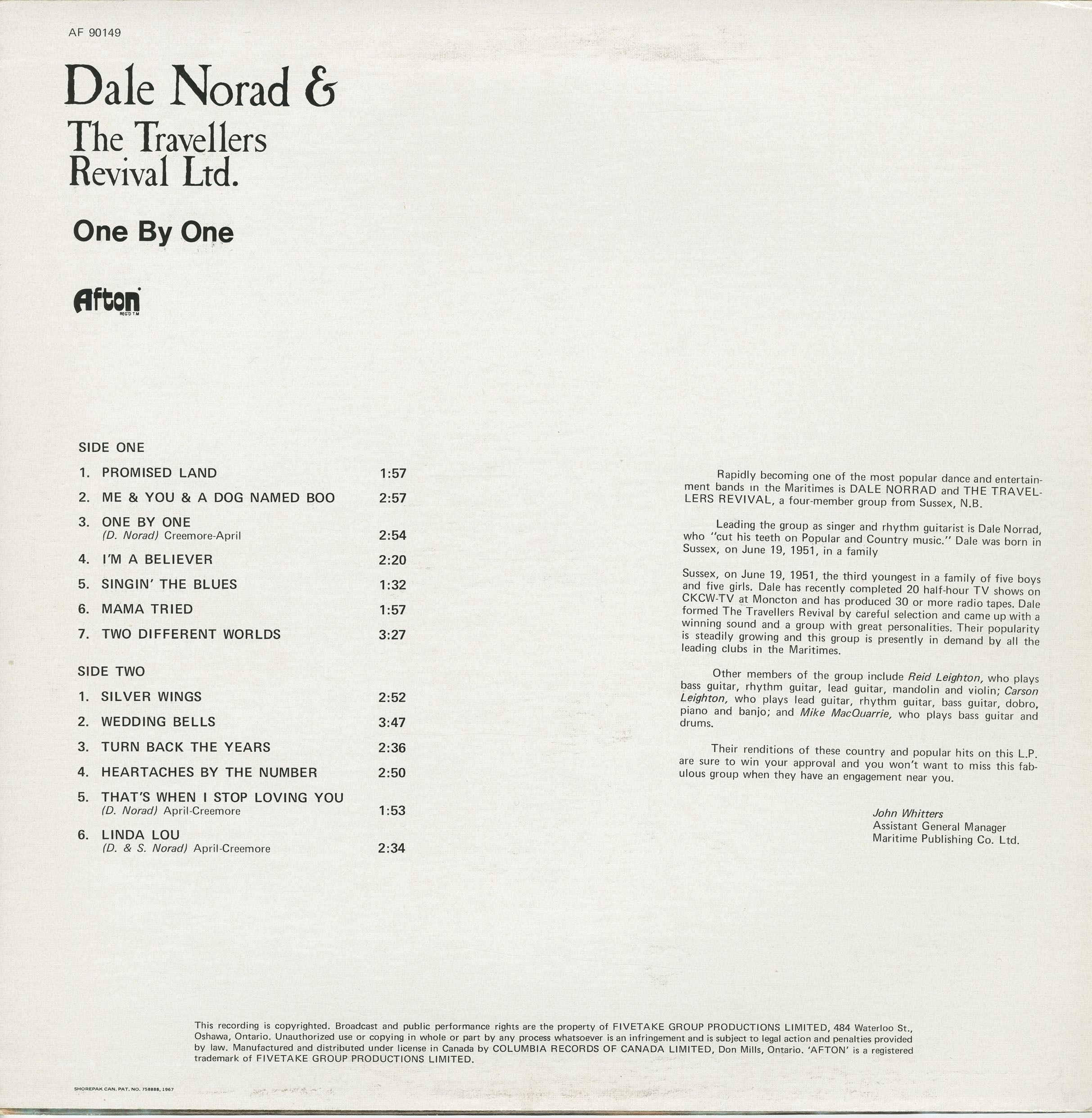 Norrad “loved music” and, while in Canada, performed in “a successful country band that travelled extensively and recorded an album,” aligning with the Dale Norad & The Travellers Revival Ltd. LP One By One on Afton Records.