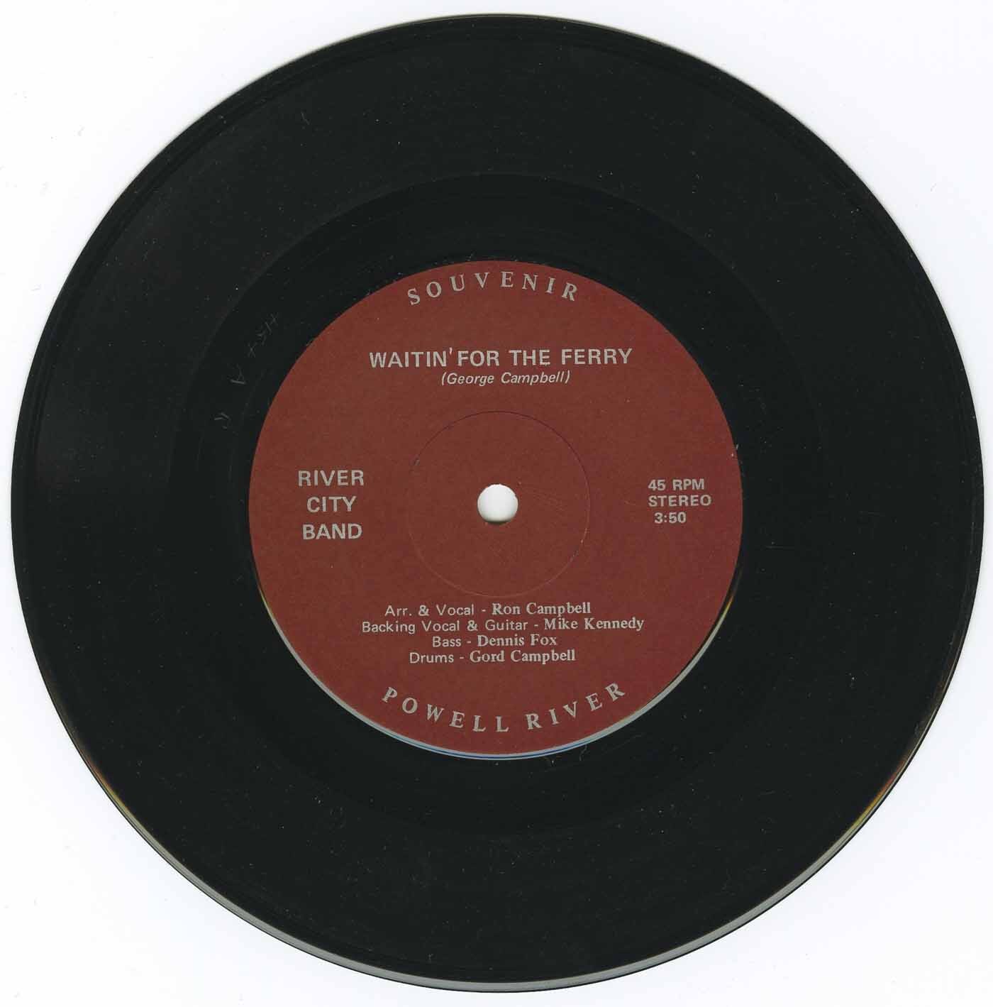 The River City Band was active in Powell River from 1977 to 1980. In 1979, the group recorded their only single "The Powell River Song" and "Waitin’ For The Ferry", both written by George Campbell (Ron and Gord’s dad), who also financed the recording. These songs were recorded at Vancouver’s Psi Chord studio, engineered by the legendary Robin Spurgeon. Bass player Dennis Fox was also hired for this session. Ron Campbell played piano on Waitin’ For The Ferry, and banjo and harmonica on The Powell River Song, and Ron Irving played lap steel on The Powell River Song.