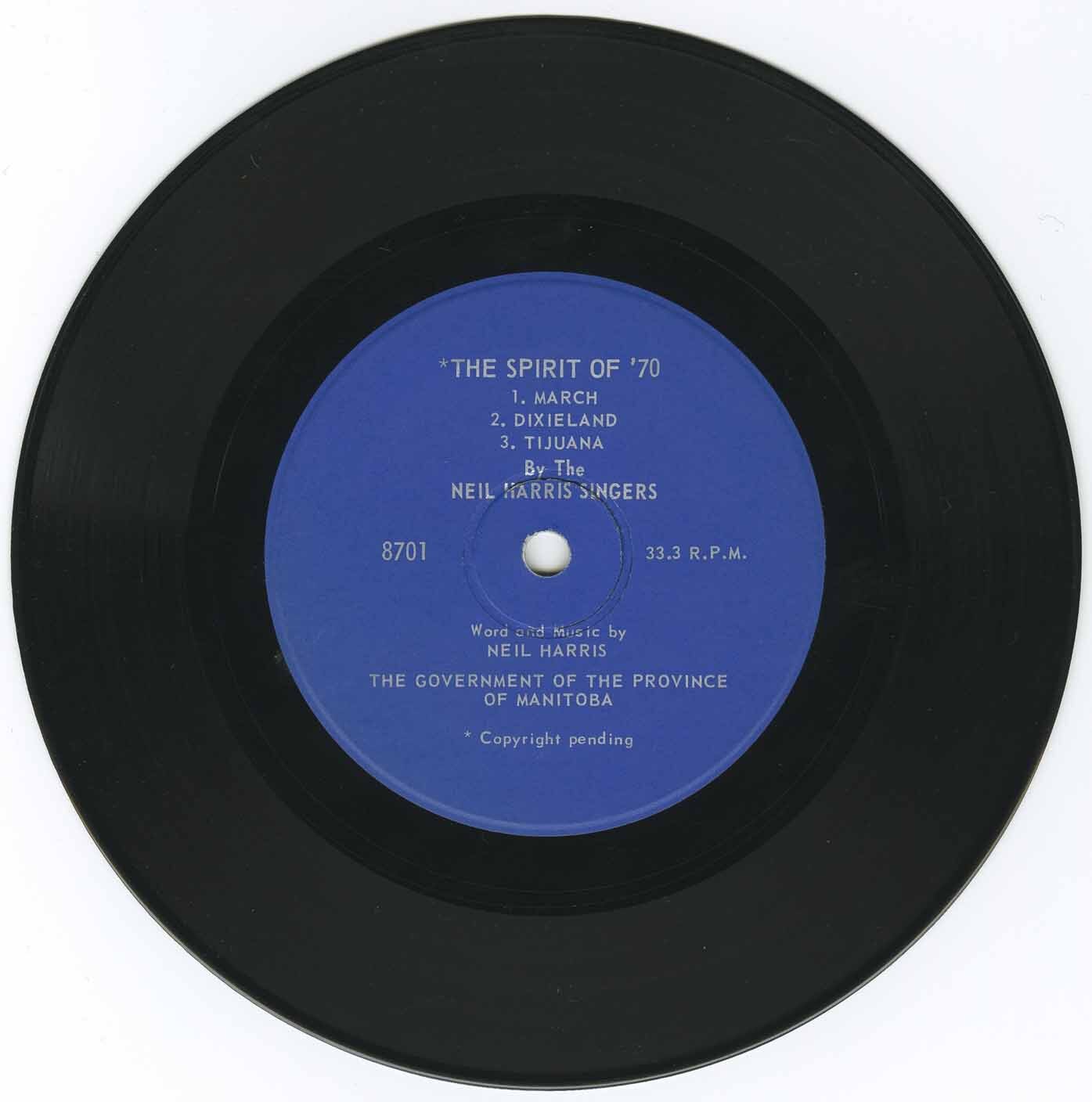 In January 1968, two years before the centennial year, the province announced that Manitoba's Department of Industry and Commerce was releasing Spirit of 70, a song it had commissioned from Manitoba composer Neil Harris.