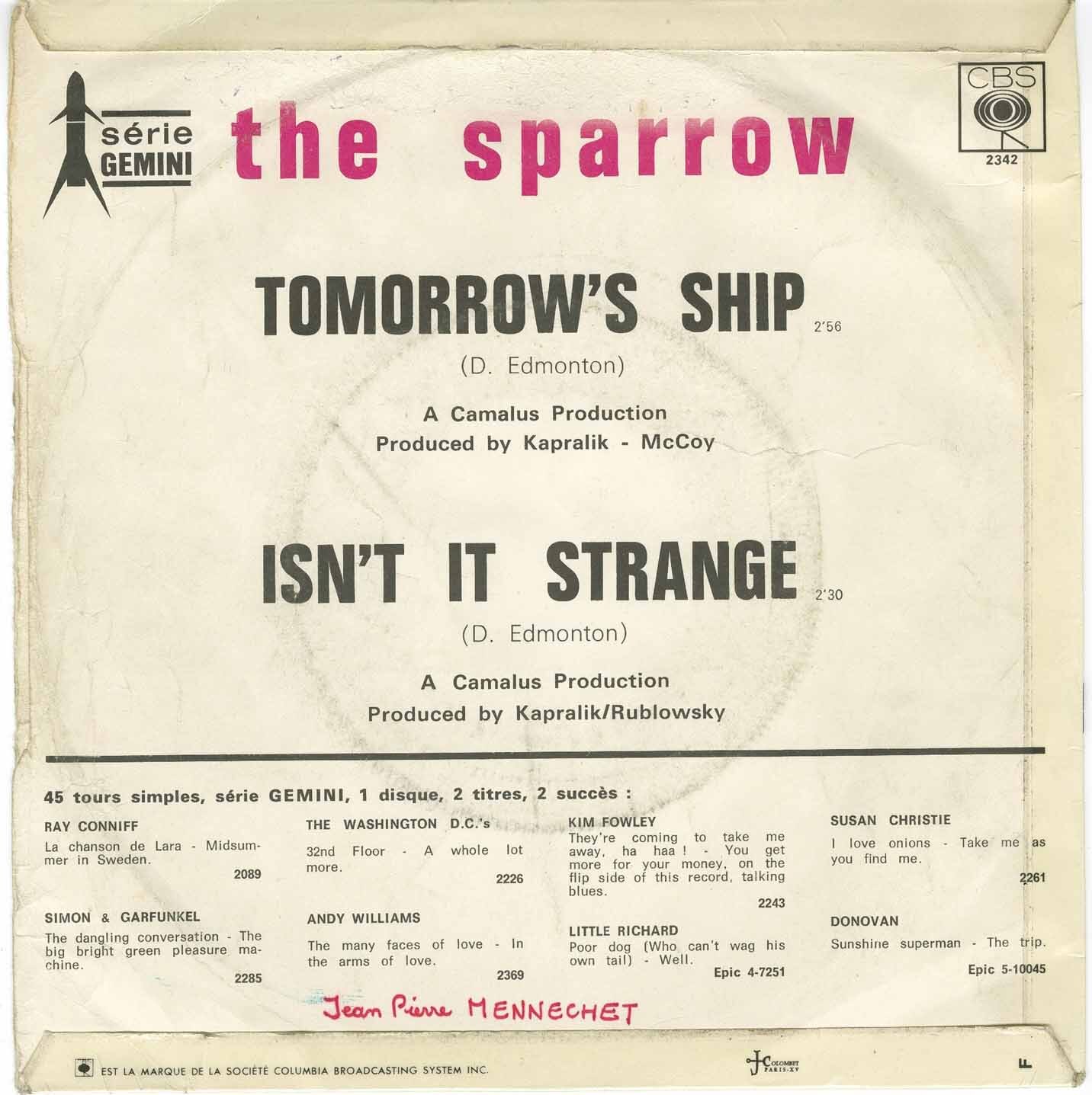 Now commuting between Yorkville and Greenwich Village as the hipper-sounding Sparrow, they posted themselves on the cusp of psychedelia with their debut seven-inch 'Tomorrow's Ship' in mid 1966. After the opening guitar distortions, the song settles into a blithe and jangly piece of California pop, with shades of (labelmates) the Byrds or the Mamas and the Papas at work here. The aptly named 'Isn't It Strange' is indeed that and more, delving deep into the crevasses of acid weirdness. And the spacey, meandering guitar noodles predate Syd Barrett's work with Pink Floyd - and that's really saying something.