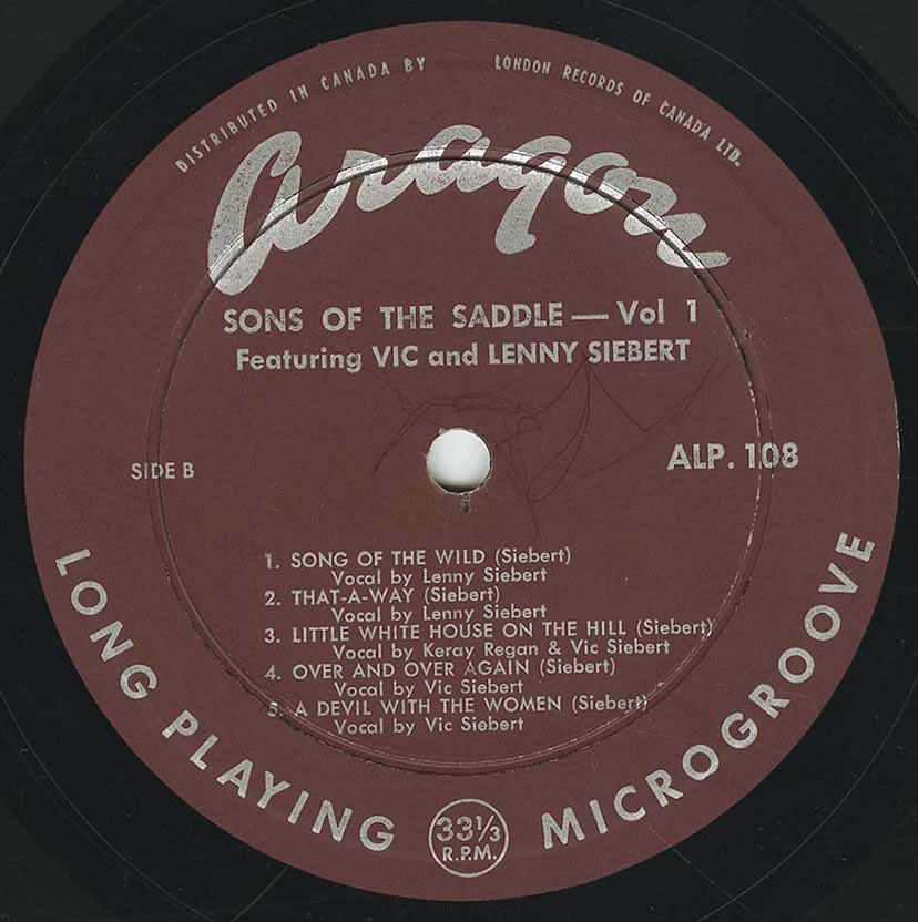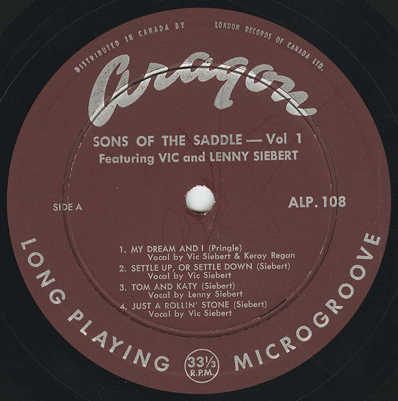 The group’s recorded output consists of a small but significant run of Canadian LPs issued in 1959 and the early 1960s. Two albums were released on Aragon Records—Sons of the Saddle Vol. 1 Featuring Vic and Lenny Siebert (ALP 108) and Sons of the Saddle Vol. 2 Featuring Gene Siebert (ALP 113)—documenting different Siebert-led configurations of the band. A later self-titled LP on Canatal Records (CTLP 4003) presented a repertoire drawn largely from contemporary country standards alongside original material associated with the group.