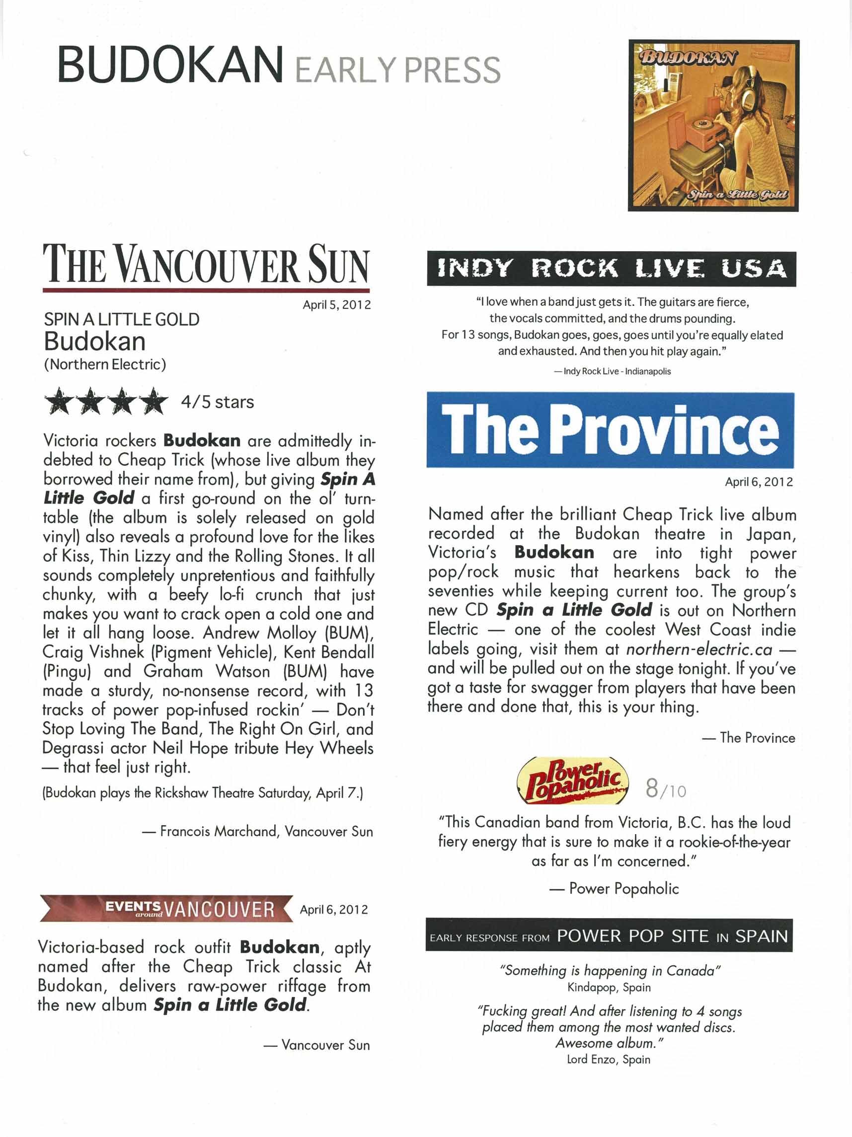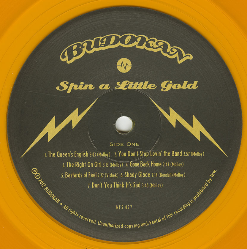 After intermittent recording activity through the late 2000s, Budokan reconvened to complete their debut full-length album, Spin a Little Gold, released in 2012 on Northern Electric Records. Issued on 180-gram gold vinyl, the album marked the band’s most fully realized statement, consolidating years of songwriting into a cohesive collection of power-pop and rock material. The album was later released on compact disc in Japan via SP Records, extending Budokan’s reach beyond Canada.