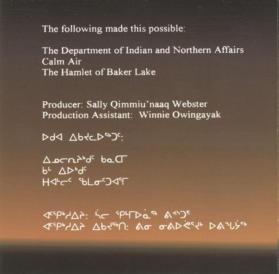 “I am so grateful to you for making these recordings from Baker Lake available. These songs, because of you, are now going to become part of the children's education. Their language and culture is vital to their identity, and there is so much erosion of it from competing distractions. Most of the children speak English and don't know Inuktitut. These songs will connect the younger generations, and future generations, to their roots. These songs will reconnect the younger generations to their culture and their language. Thank you for making that possible. There are still some Elders in Baker Lake who lived a traditional, nomadic life before moving to Baker Lake.”