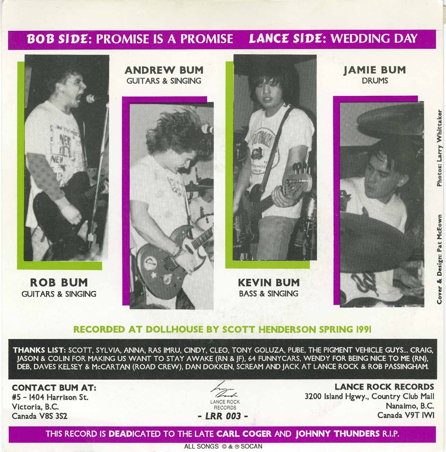 Bum’s debut full-length album, Wanna Smash Sensation! (Munster Records, 1993), brought together singles, new material, and extended experiments such as the side-long track ‘No Idea’. Recorded primarily at Egg Studio in Seattle and produced by Bloch, the album showcased the group’s range—from concise power-pop blasts to looser, jam-oriented structures—and has since become a cult favourite among collectors of Canadian punk and pop-punk records. The album’s combination of immediacy, charm, and unpolished energy has helped it endure well beyond the band’s original lifespan.