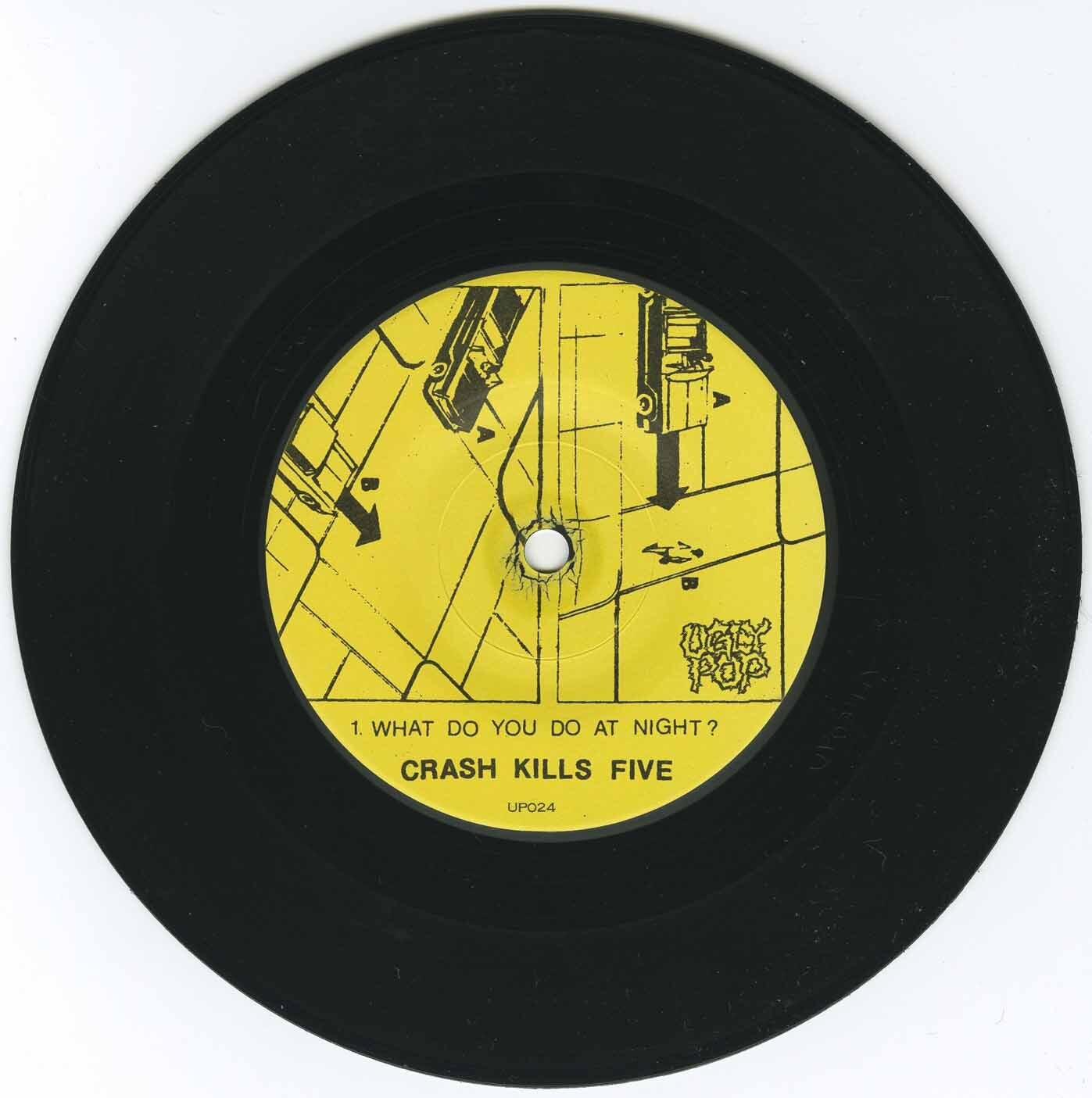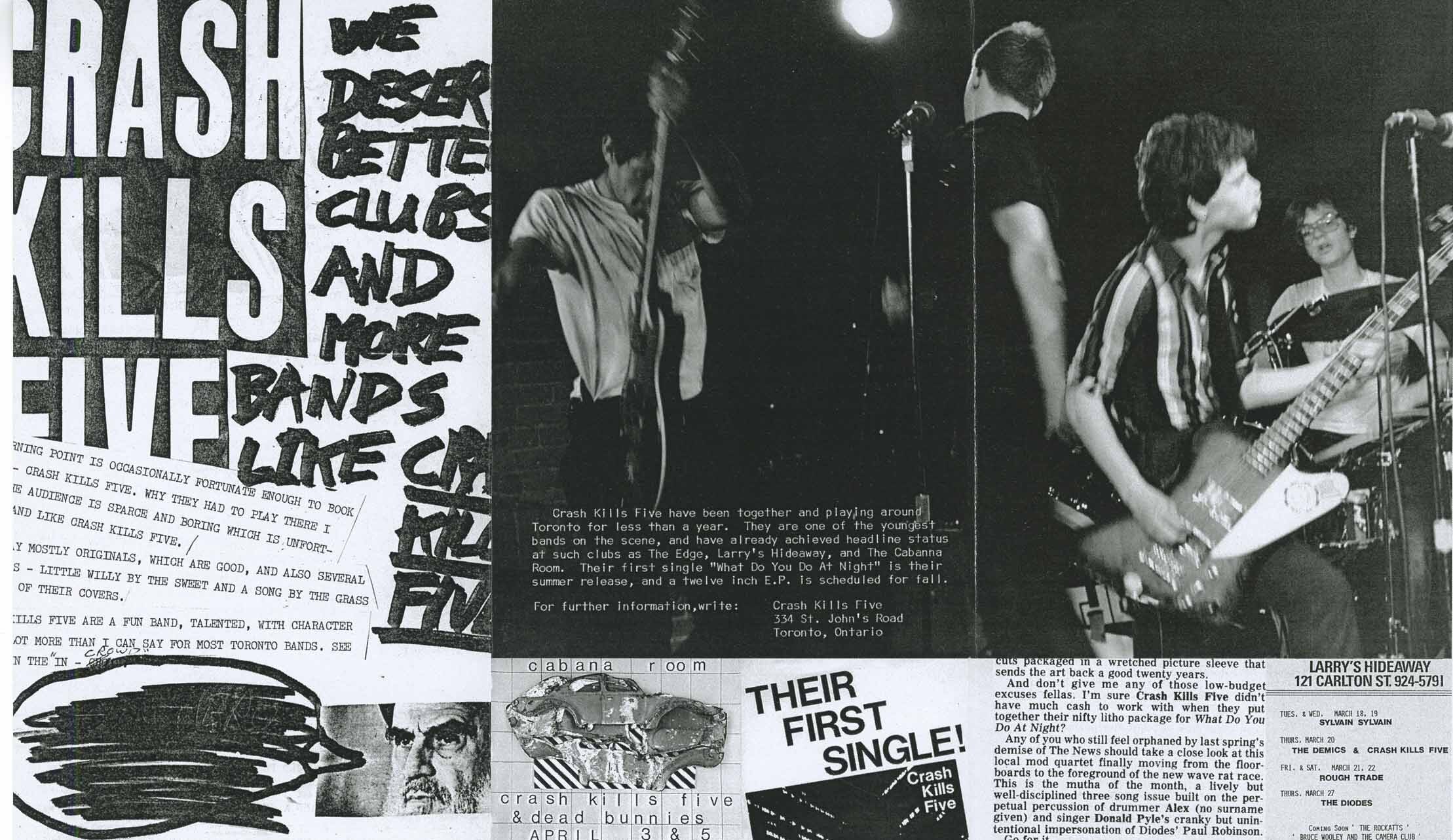 These guys (Crash Kills Five) sounded very punk rock and were strongly compared to the Ramones and even Teenage Head. Some members went onto become Shadowy Men On A Shadowy Planet which was a more garage and surf type sound. All of the group members were excellent musicians and Shadowy Men were made famous when they did the music for the excellent Canadian comedy 'Kids in the Hall.' We in Western Canada still miss Reid Diamond who left us back in 2001. Just like Frankie Venom of Teenage Head both guys entertained us very much back in the days. Reid was a super guy and will always remembered.