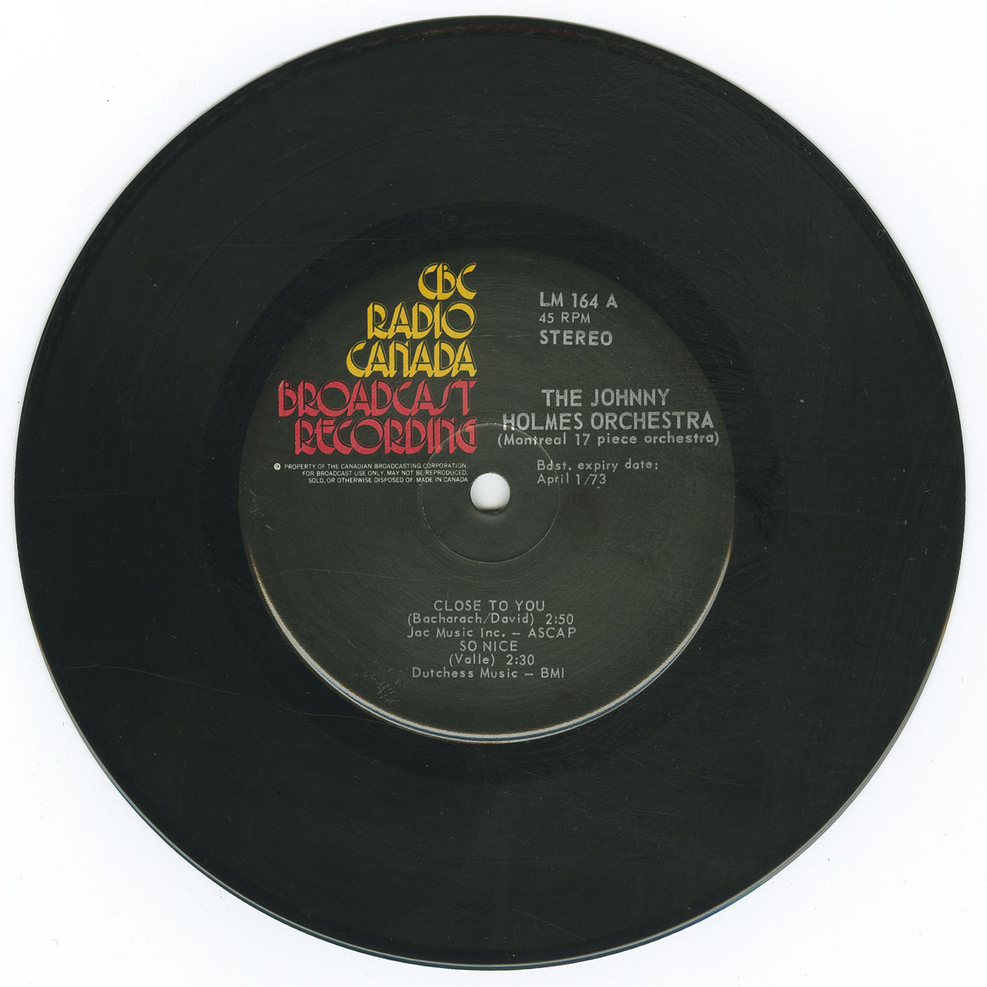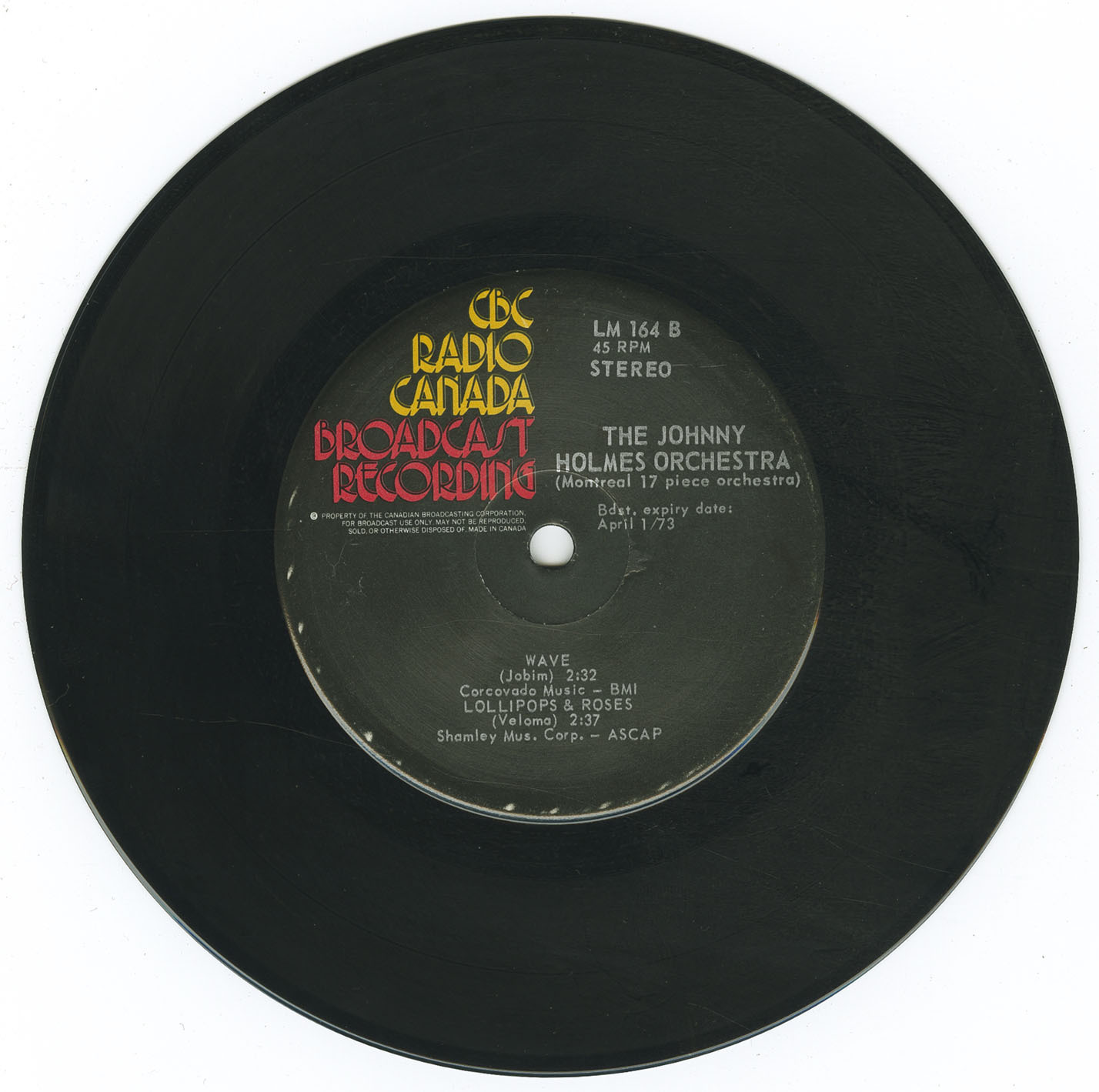After retiring from music in 1951, Holmes returned in 1959 to front orchestras for CBC Radio. Throughout the 1960s he was heard regularly on programs like The Johnny Holmes Show and Broadway Holiday, blending Broadway sparkle, light music, and jazz into a polished orchestral style. Between 1966 and 1973 he recorded a total of six broadcast-only albums and singles for the CBC’s LM (Light Music) series. These were pressed in tiny quantities and distributed in plain stock sleeves, never sold commercially. Among them were two sought-after LPs — Johnny Holmes Orchestra – Ray Berthiaume and Margo McKinnon, vocalists (CBC LM-16, 1966) and Johnny Holmes Orchestra – Ray Berthiaume, vocalist (CBC LM-29, 1967). He then experimented with a brass-heavy ensemble under the name Brass Therapy, recording CBC LM-164 (1971, released 1973) with “Close to You,” “So Nice,” “Wave,” and “Lollipops and Roses,” and CBC LM-192 (1972), featuring For Once in My Life (arranged by Holmes), Love Story (trombone feature for Claude Blouin), Watch What Happens (guitar feature for Tony Romandini), and Lonely Is the Name. In 1972 Holmes also cut CBC LM-207, a 45 pairing Gordon Lightfoot’s “If You Could Read My Mind” and Gene MacLellan’s “Put Your Hand in the Hand” with his own composition “Rainbow” and MacLellan’s “The Call.” His final entry came with CBC LM-266 (1973), a 45 featuring “Si tu parais” and “Alouette.”