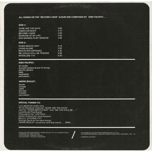 May 7, 2014: Dino Pacifici's first recording, 'Become a Man' has become a personal favourite album of mine. It was pressed in a quantity of 500 copies and has become hot in the collector market - for good reason. The album has also received a lot of airplay on this website. Thanks to Dee for allowing folks to stream the album on mocm.ca. "It was recorded and mixed in my friend's eight-track studio in a converted lawnmower shed. Glad you are enjoying it. I started writing the songs when I was 13 and finished the writing at 19. The album was then recorded. Great experience!"-Dino Pacifici