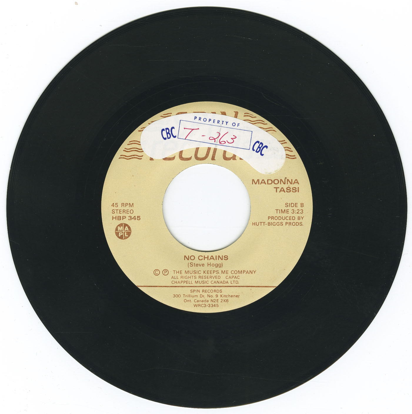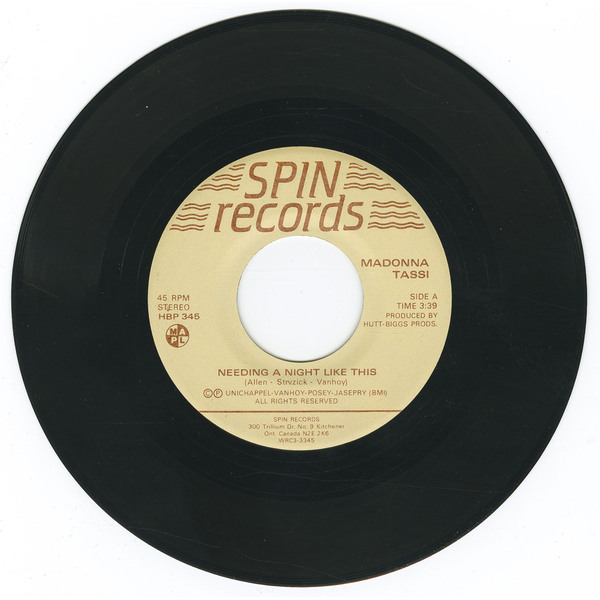 To display the strength of Madonna's voice in a range of styles, Spin Records has recorded two songs. The A side, " Needing A Night Like This ", co-written by Deborah Allen ( Baby I Lied ), is a smooth, accessible composition that would be at home on either country/crossover or adult contemporary playlists. "No Chains", the flip side, is a high energy, pop/dance piece written by Steve Hogg (Ian Thomas Band, Ronnie Hawkins Band). The A side is two parts MAPL, the B side four parts.