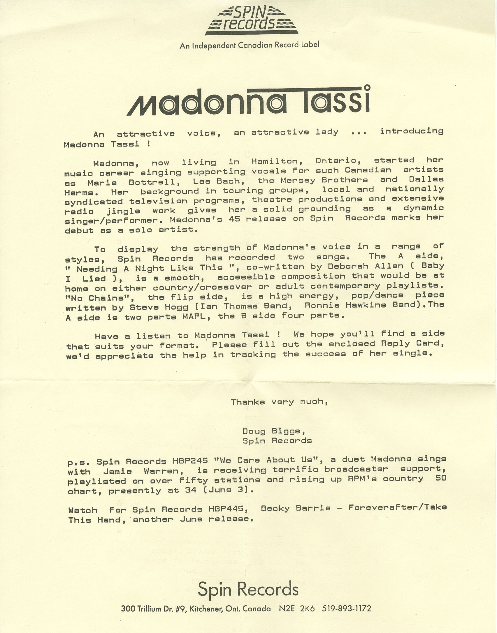 Madonna, now living in Hamilton, Ontario, started her music career singing supporting vocals for such Canadian artists as Marie Bottrell, Lea Bach, the Mersey Brothers and Dallas Harms. Her background in touring groups, local and nationally syndicated television programs, theatre productions and extensive radio / jingle work gives her a solid grounding as a dynamic singer/performer. Madonna’s 45 release on Spin Records marks her debut as a solo artist.