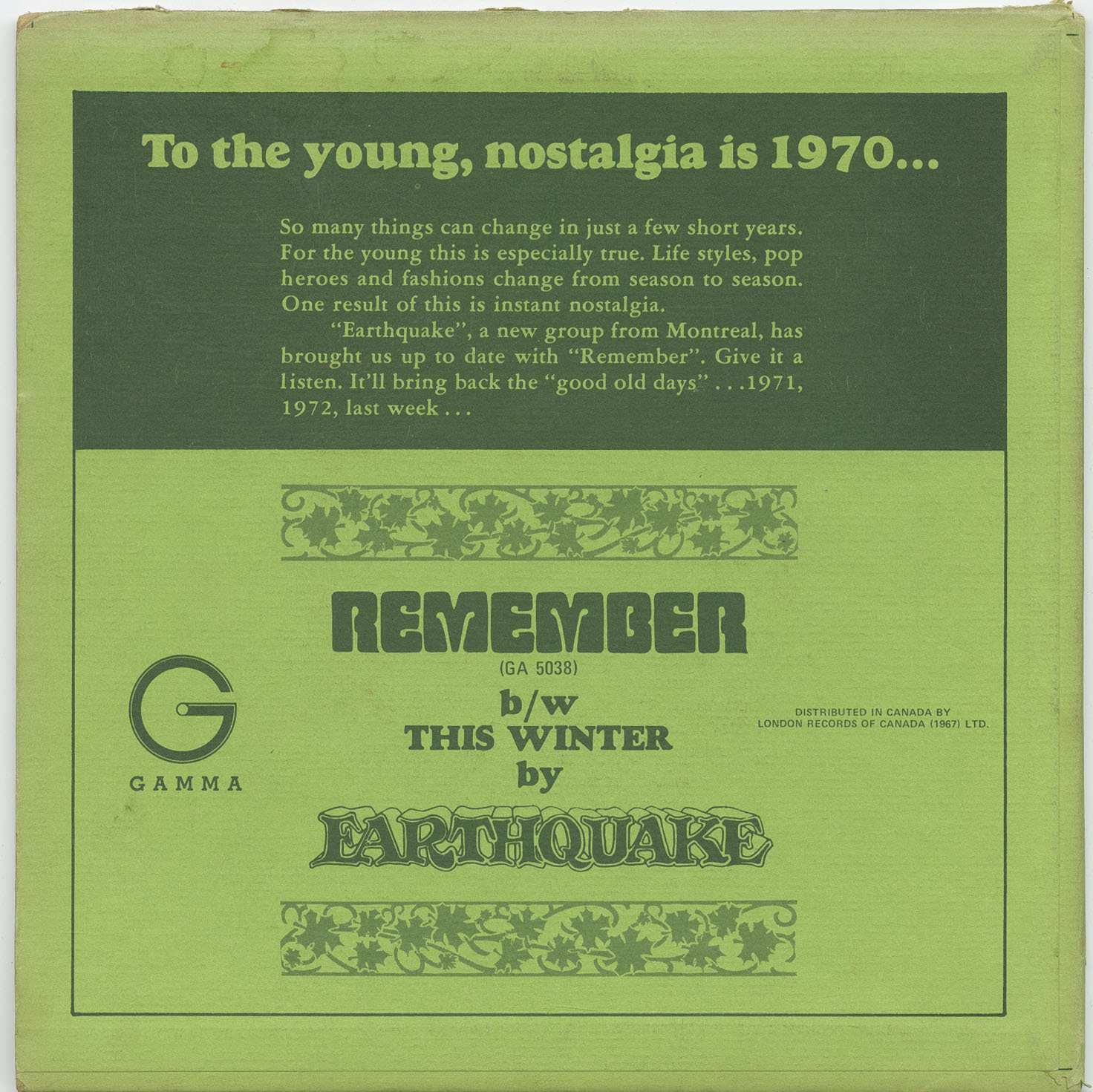 “Earthquake,” a new group from Montreal, captured this feeling with their single “Remember,” backed with “This Winter.” The record invites listeners to reflect on the “good old days,” whether they were in 1971, 1972, or even just last week.