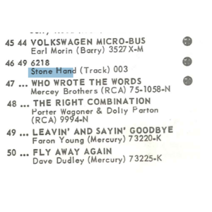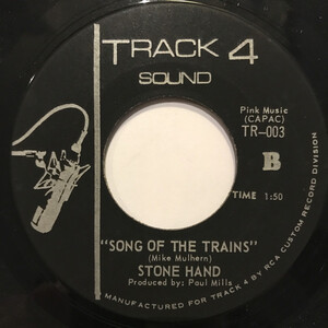 The locomotive, the last active steamer on CN, was a subject of interest to Assaf. His hotel, being directly across the street from the CN Tower in London, contained a number of oil paintings of famous Canadian steam locomotives, as well as a number of rail artifacts prominently displayed about the wall s o f the building. Mr. Assaf told Mulhern the story of the locomotive and suggested they collaborate on a song about the engine. A number of tunes and lyric ideas changed hands between the two over the next three months, and when the first draft of the song was completed, it was recorded at Track 4's studios, operated by Walter Crasser. Crasser subsequently became Mike' s manager and diehard promoter of the song. The initial recording of the song prompted the writers to initiate some changes in the structure of the song, and it was then completed in its present melodic form two weeks later. The song was again recorded at Track 4. Shortly after the take was completed, Mulhern teamed up with singer-guitarist Don Mathers to form what is now known as Stone Hand. Together they began performing and promoting the song "6218" along with Assaf and Crasser. Their promotion efforts have taken Stone Hand on the UCRS winter excursion of January 24, 1971, from Toronto to Orillia, where a film crew from the CBC television show "This Land" filmed the group and their song. The song and also "The Song of the Train " were broadcast on the "This Land" television show nationally on February 24, 1971 (and again on July 14). The song has also been performed on CFPL-TV in London, and article s on the song and the train have been published in newspapers throughout the country. The subject of the Stone Hand's song “6218” needs very little introduction to railfans. Although the recording may not help to keep the engine in operation, it is designed to preserve the memory of the locomotive, and in some way preserve the memory of steam. The flipside of the record is a beautiful treatment of the song that started it all "The Song of the Train".