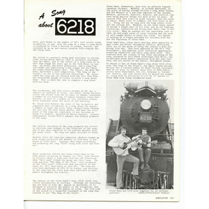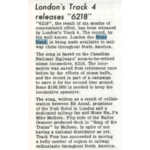 6218, well-known as the number of CN's last active steam locomotives, now also the name of a song - a song which is produced by Track 4 Records of London, Ontario, and recorded by an up-and-coming Canadian folk-singing duo, the Stone Hand. The record is currently being made available to railfan clubs across North America (and is currently available from the UCRS) and is the result of a long train of events that began two years ago at the York Hotel in London. Ed Assaf, the hotel proprietor, and a long-time rail-buff, was auditioning a new singer for his Thursday night entertainment spot. The artist, one Mike Mulhern, performed a self-composition, "The Song of the Trains, " as one of his audition selections. Mr. Assaf liked the song and was pleased with the fact that Mike was interested enough in trains to write a song about them. This is when the idea to compose a song about 6218 was born.