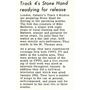 Stone Hand, themselves, have felt an affinity towards Canadian railways. Mulhern, as already mentioned, to the point of having already written a song about trains, and Don Mather s as a one-time employee of the railway. Mathers - guitarist, banjoist, harpist, and vocalist, has been doing musical things for most of his 23 years. He started with four years of pian o lessons, then two years of banjo, three years of trumpet, and five years of guitar. Along the way he sang with two high school trio s and one college duo. Mulhern, on the other hand, wanted to become a singer most of his life, but he let banking, soldiering, journalism and acting have their time in his life first. When he reached for the inevitable late i n 1969, he had eight years of vocal training and one year of self-taught guitar to press his claim. Si x months of working as a single precede d his alliance with Don and the beginning of Stone Hand. Stone Hand have, since their meeting, been appearing in many clubs and hotel s throughout Ontario, developing their act to the point of being the country' s most promising folk duo. They have appeared on CBC-TV's "The Performers", and numerous local television appearances promoting themselves and their song about 6218. This, combined with the release of the final recording of the song, produce d by well-known folksinger Pau l Mills, has established Stone Hand's reputation with not just rail - fans, but al l facet s o f the public, throughout Canada. To obtain a copy of Stone Hand's song about 6218 (flipside "The Song of the Train"), the Upper Canada Railway Society has a limited number of these records available. Send $1.19 (plus 58 Ontario Sales Tax) to UCRS Publications Sales Department, Box 122, Termina l A, Toronto 116, Ontario, and you r record will be mailed out promptly, along with an attractive 8-1/2" by 17" poster of Stone Hand with steam locomotive 6218.