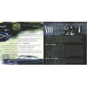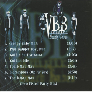 At least some of this hysteria can be blamed on the inclusion of the Vampire Beach Babes underground hit 'Gothic Surf-a-rama' on the premier Gothic music compilation 'Gothic Sanctuary'. Such recognition no doubt exacerbated the spread of the Vampire Beach Babes madness. Their December 1st 2000 performance at the Opera House in Toronto was voted as second best performance of the year 2000 (second to VnV Nation and tied with Nine Inch Nails) by Gothic online community Dark Entries (www.dark-entries.com), further accelerating the spread of this scourge. Cover page mention and feature of the Vampire Beach Babes in the widely celebrated horror magazine Rue Morgue did nothing to protect the general public from this menace. Spanking in New Years 2001 with a midnight performance to 500 wanton fetish scene aficionados, at The Big Bop in Toronto, Canada, brought this insanity to a fevered pitch. Then, Halloween 2001 at the Fetish Masquerade and of course the now infamous RCA Records showcase at CBGB's Gallery in New York City! At Toronto's Velvet Underground in February 2002, the TV camera crews of BRAVO and The New Music did their part in documenting this public menace. Furthermore, the president of TROMA Entertainment (the great Lloyd Kaufman) has hand picked the VBB to write the theme song for TROMA's next worldwide release feature film "Tales From The Crapper".