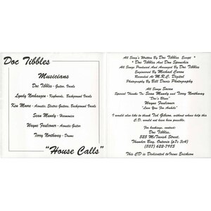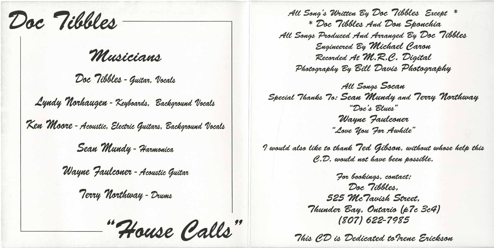 Doc took to travelling out west from time to time. On one occasion a number of us spent a few days on the remote Nahatlatch River to get a break from the city. Doc and I were out canoeing and we had the misfortune of capsizing. Nothing serious and we easily righted the canoe and resumed paddling but Doc had been wearing leather pants. He ended up having to wear the sodden things all day, allowing them to dry naturally so that they’d still fit, since he said this had happened once before and they had shrunk so considerably he had to get rid of them. But throughout it all he laughed and smiled. At one point in the 80’s Doc headed south to Mexico’s Pacific coast, where he remained for a couple of years, living in a beachfront hut. Coming from north Ontario, Doc was a good fisherman, so he would fish in the mornings, sell his catch, and then play guitar in the evenings at one of the local bars. Eventually he got a little too tangled up in amorous intrigues and returned to Canada, with a few songs and a lot of memories. He cut a second album, Unattached Tunes, which includes a few of those. Doc caught a dose of the travel bug and spent time in Europe and Japan among other places over the next several years. Gord moved away to Toronto and then to Winnipeg and I got married and settled down in Victoria and we all just fell out of touch. A couple of years ago I went on one of those legendary cross-country road trips with my daughters and we happened to be having lunch at a roadside diner in northern Ontario when I realized that the booth next to us was occupied by musicians. I leaned over and asked them if they happened to know Doc Tibbles. “Of course, he’s a legend around here!” came the quick reply. In fact he had a new CD out called House Calls. He was still playing and living mostly in Thunder Bay and making music. I hope he will continue to do so for years to come.